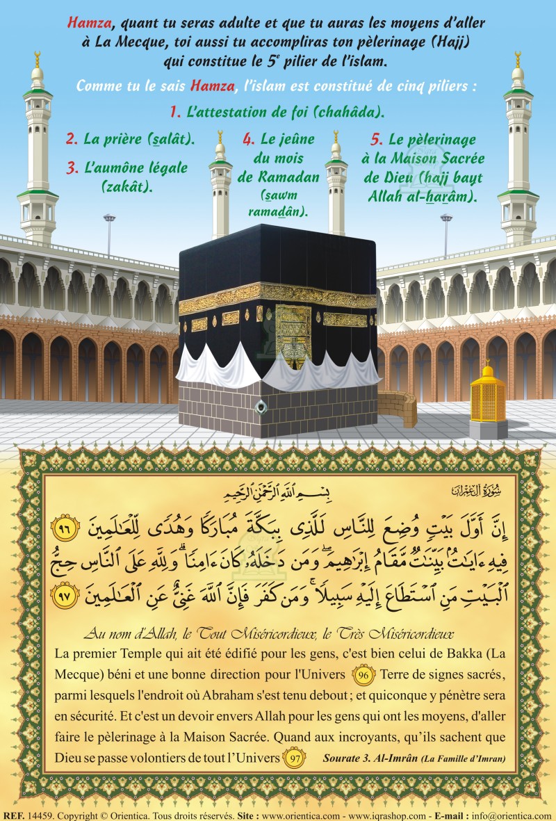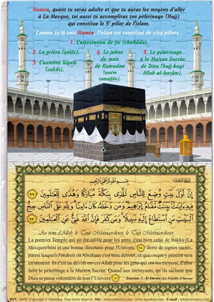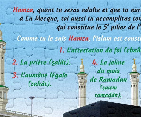 Le puzzle est personnalisable avec le prénom de l'enfant : Hamza, quant tu seras adulte et que tu auras les moyens d’aller à La Mecque, toi aussi tu accompliras ton pèlerinage (Hajj) qui constitue le 5e pilier de l’islam. Comme tu le sais Hamza, l’islam est constitué de cinq piliers :