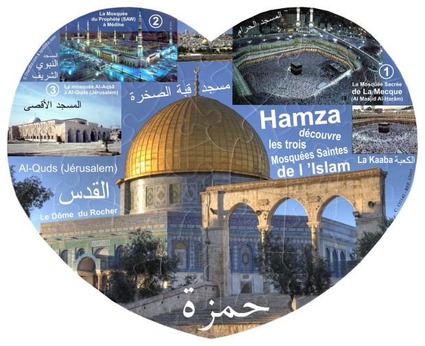 Puzzle personnalise sous forme de coeur : Les trois Mosquees Sacrees de l'Islam (bilingue)
