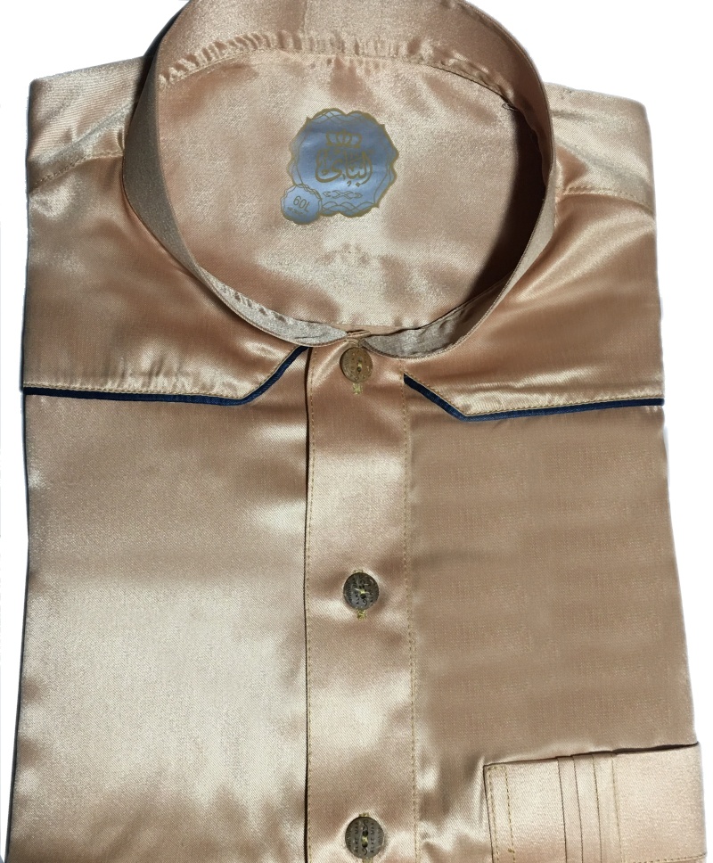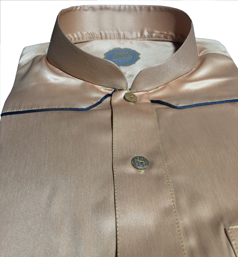 Qamis de couleur ocre, satiné avec décoration bleues marine niveau de la poitrine et des manches. Voir photos. Poche et arrière du col décorés.