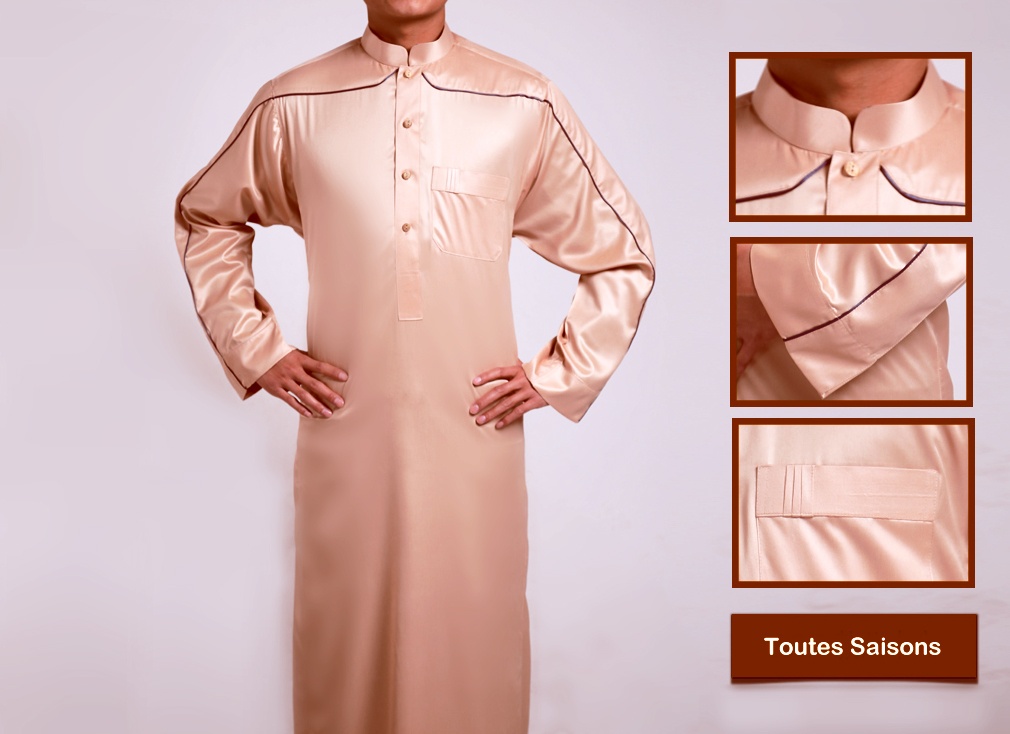 Qamis long, manches longues, ouverture boutons au niveau de la poitrine. Tissu de qualité supérieure, fluide et très agréable, satiné, adapté à toutes les saisons. Très bonnes coutures et finitions. Poche au niveau de la poitrine. Col mao décoré à l'arrière. Deux grandes poches latérales avec sous-poches internes (pour clés ou petits objets).