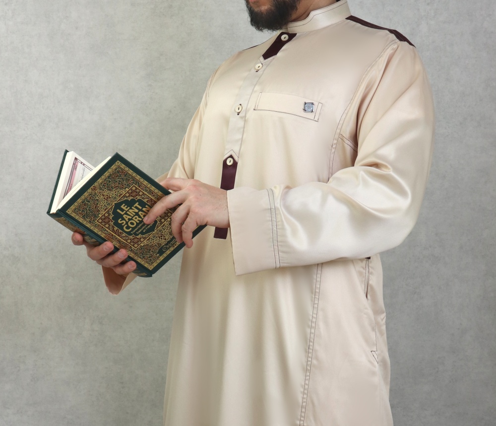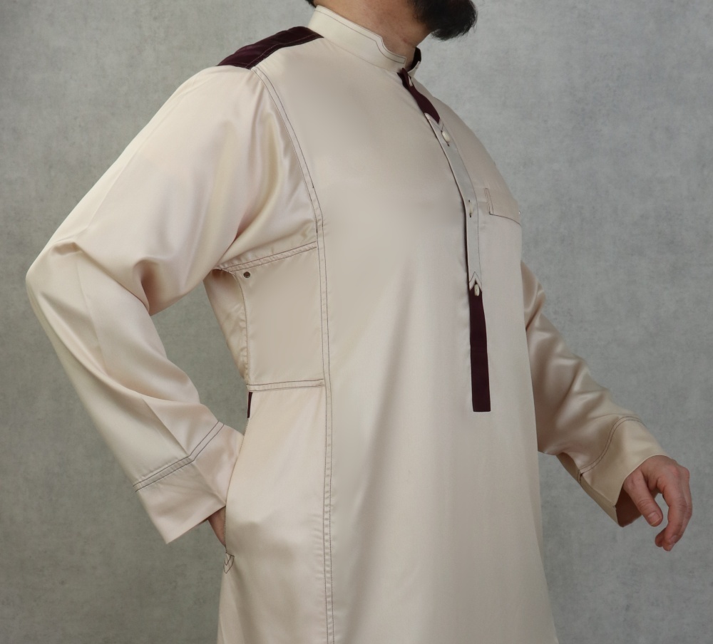 Qamis moderne de luxe tissu satiné pour homme - Couleur beige foncé et aubergine - REF. 35341 (45.00 €)