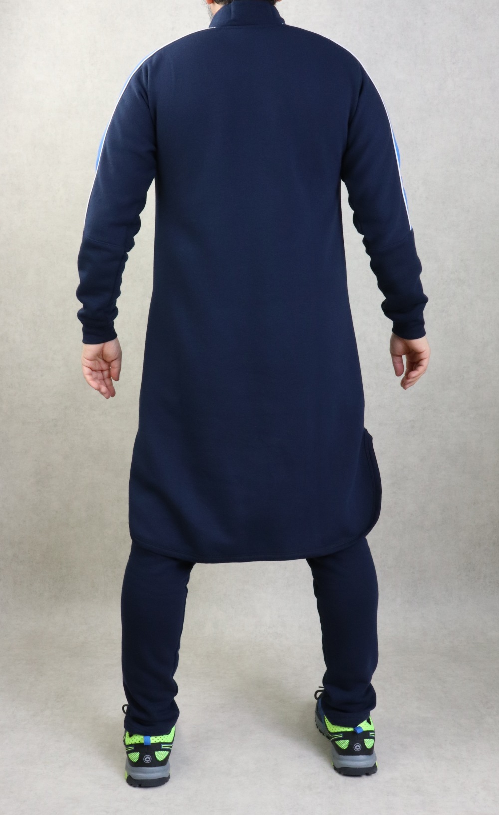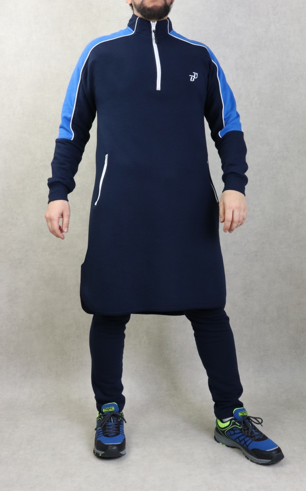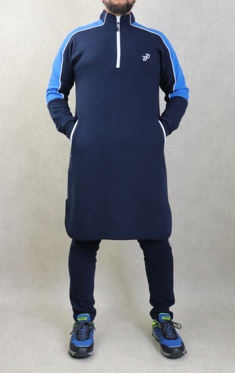 Qamis court, tissu épais coton molletonné confortable et doux. Fermeture zippée au niveau de la poitrine. Deux poches zip blanches sur les côtés. Parties bleues au niveau des épaules et des bras. Légèrement plus long derrière que devant. Brodé logo BU (Best Ummah).