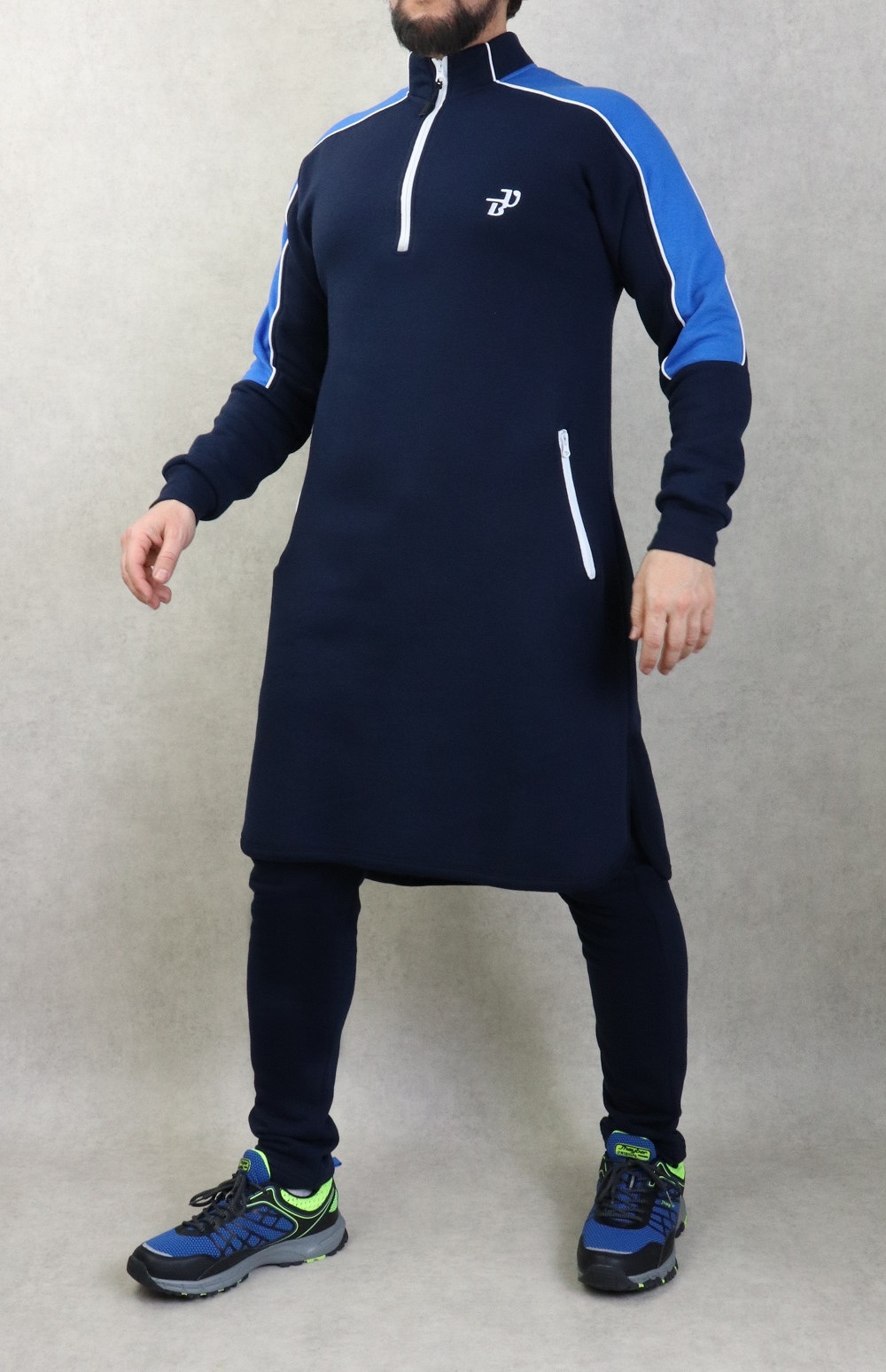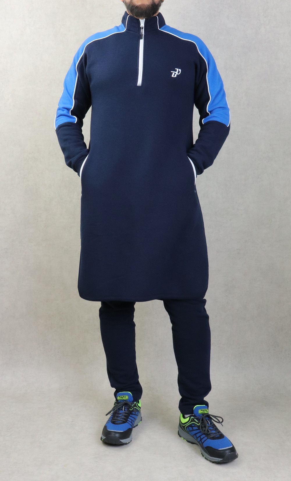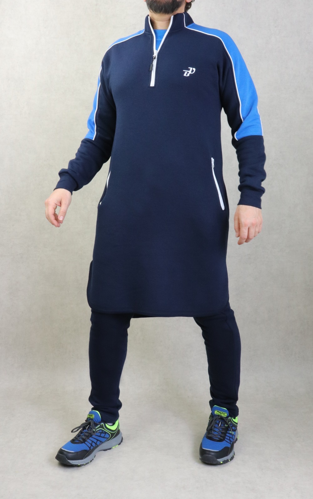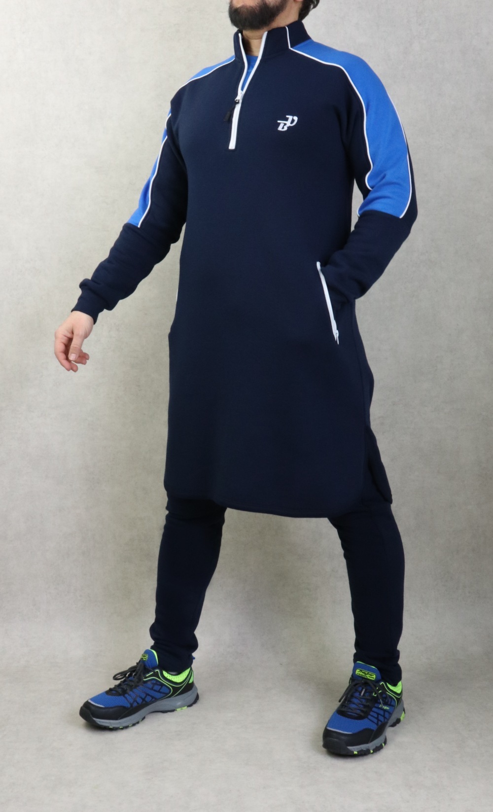 Qamis court, tissu épais coton molletonné confortable et doux. Fermeture zippée au niveau de la poitrine. Deux poches zip blanches sur les côtés. Parties bleues au niveau des épaules et des bras. Légèrement plus long derrière que devant. Brodé logo BU (Best Ummah).