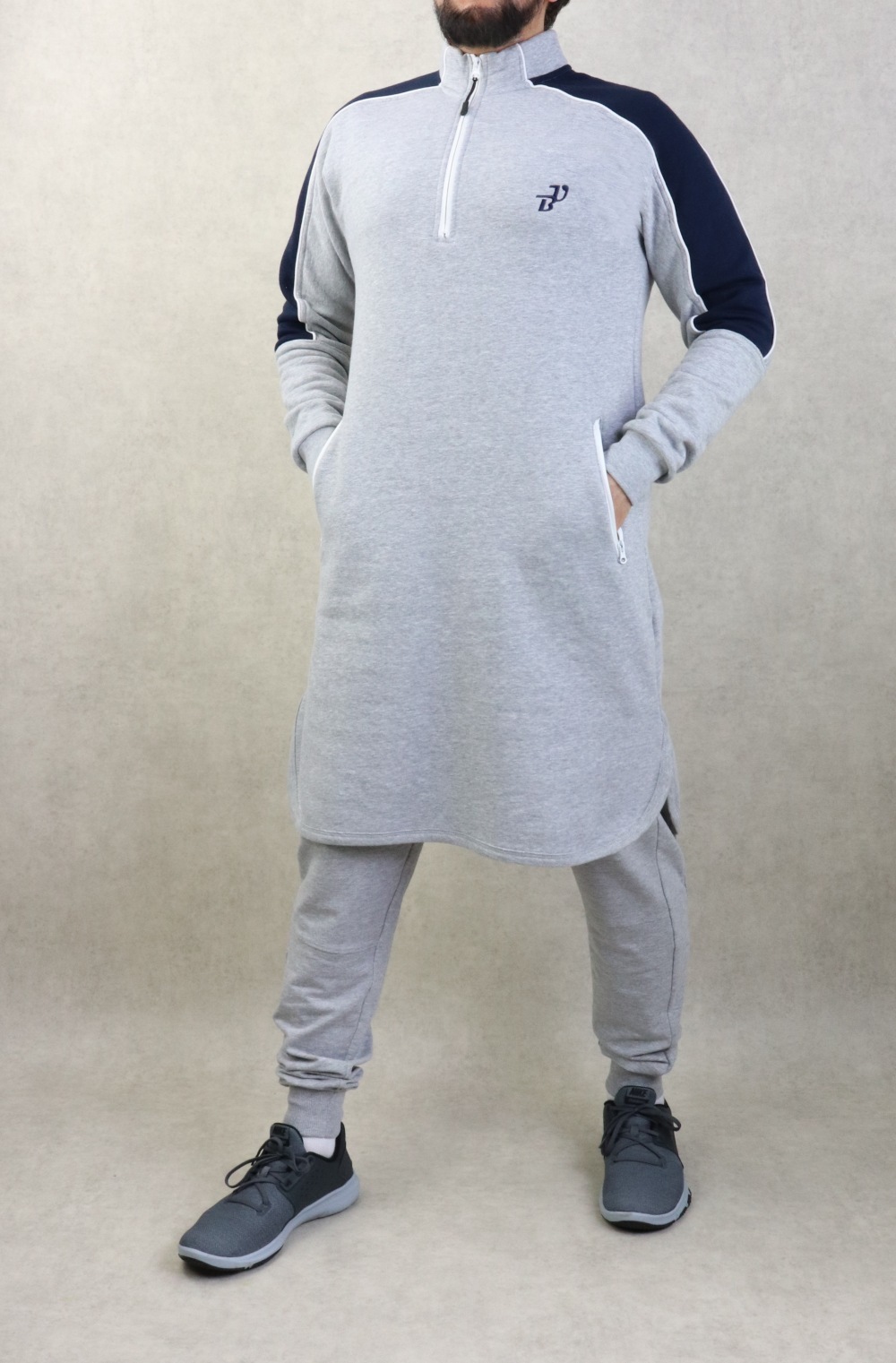 Qamis court, tissu épais coton molletonné confortable et doux. Fermeture zippée au niveau de la poitrine. Deux poches zip blanches sur les côtés. Parties bleu marine au niveau des épaules et des bras. Légèrement plus long derrière que devant. Brodé logo BU (Best Ummah).