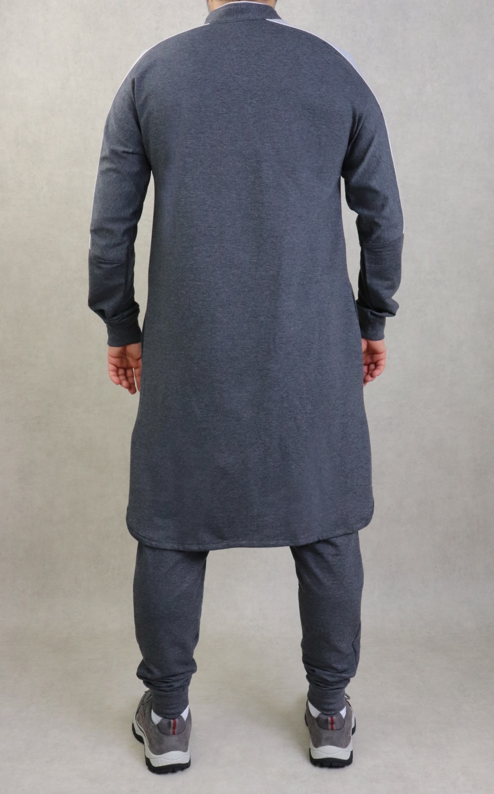 Qamis court, tissu léger ultra confortable et doux. Boutons pression au niveau de la poitrine. Deux poches zip sur les côtés. Parties gris clair chiné au niveau des épaules et des bras. Légèrement plus long derrière que devant. Brodé logo BU (Best Ummah).