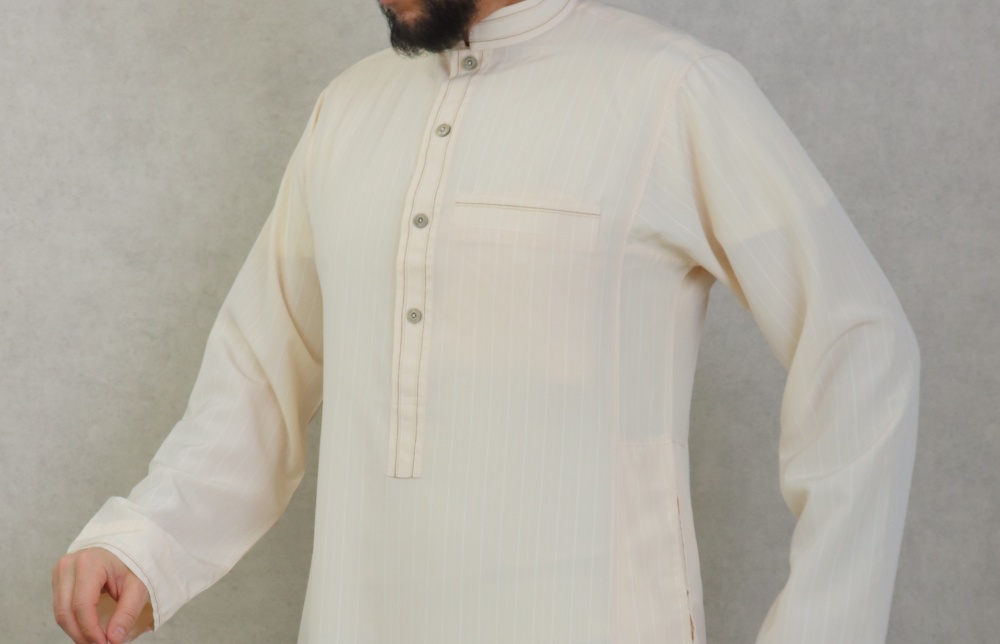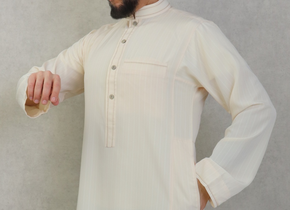 Qamis de marque AlBai de couleur blanc cassé avec de fines rayures blanches et des coutures marron au niveau du col et autres parties.