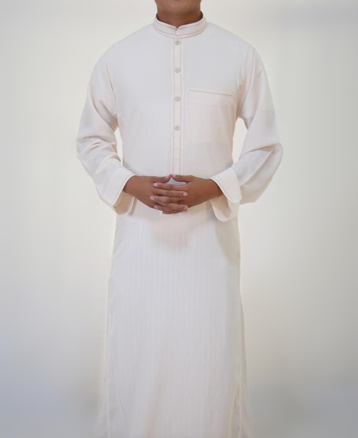 Qamis de marque AlBai de couleur gris clair avec de fines coutures bleues et gris au niveau du col et autres parties.