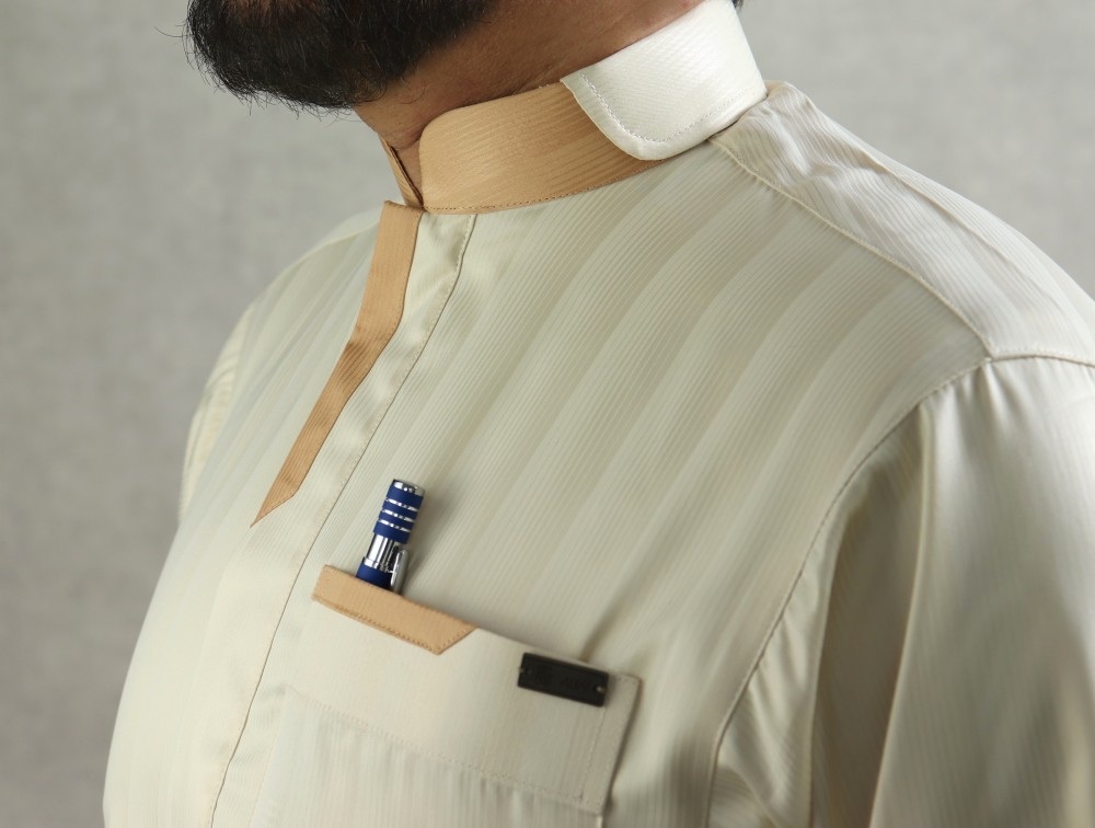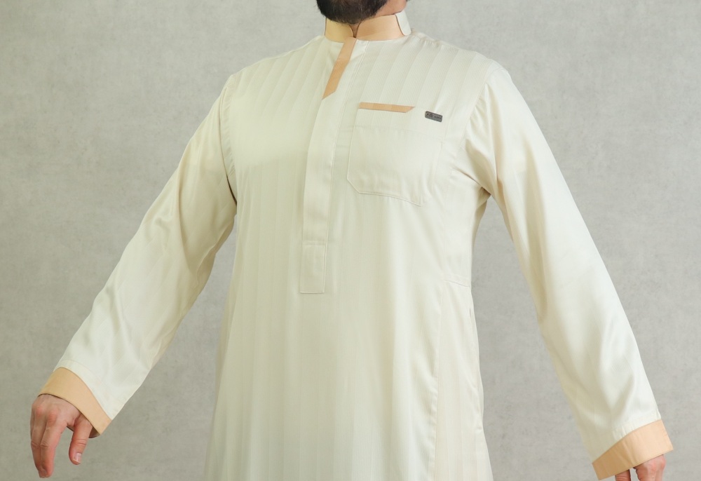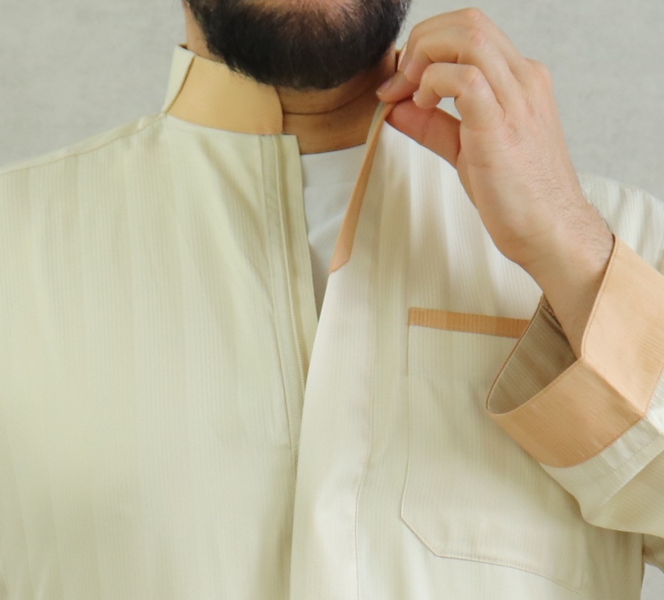 Qamis de couleur beige clair avec décorations de couleur beige foncé au niveau du col, de la poche de la poitrine et des manches (poignets). Comme sur la photo.