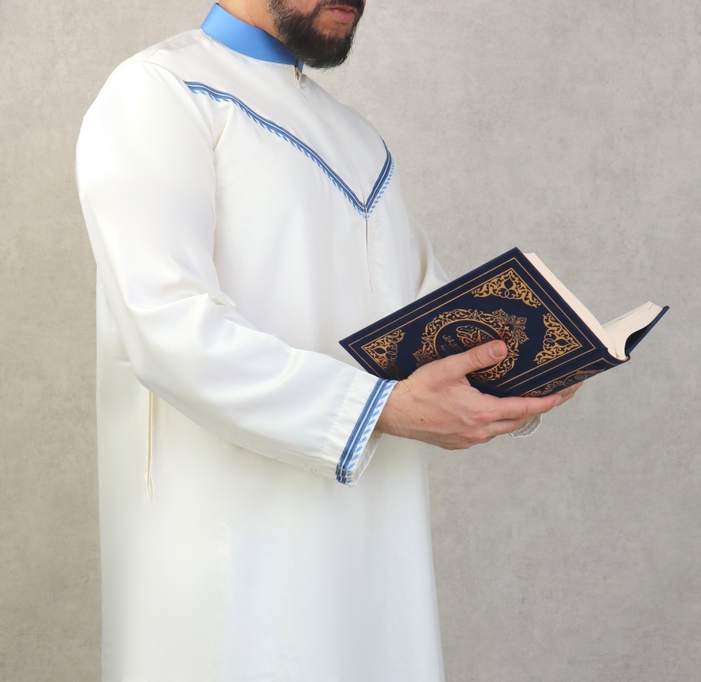 Qamis de luxe pour homme - Tissu qualité supérieure satiné - Couleur blanc cassé et bleu