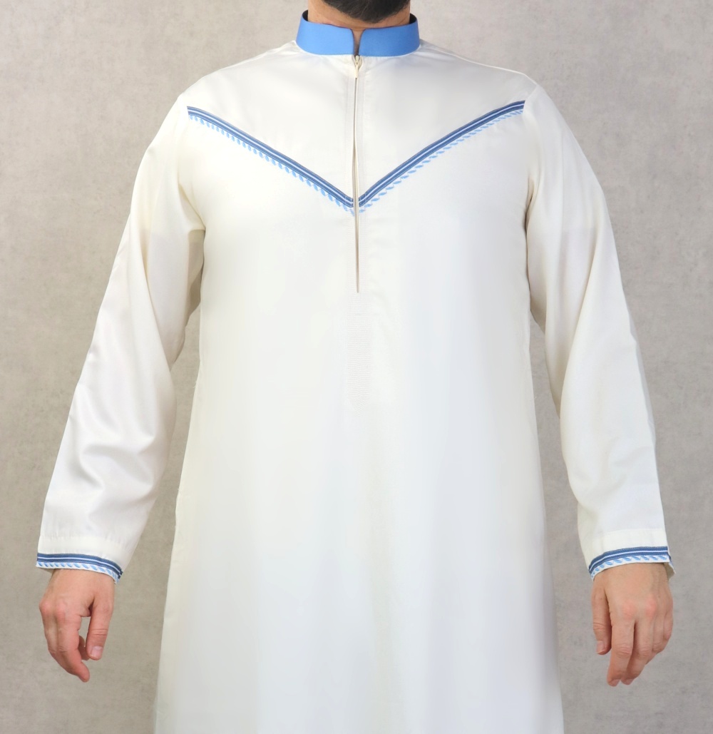 Qamis traditionnel élégant pour homme de qualité supérieure avec broderies - Couleur blanc cassé et bleu - REF. 34129 (49.00 €)