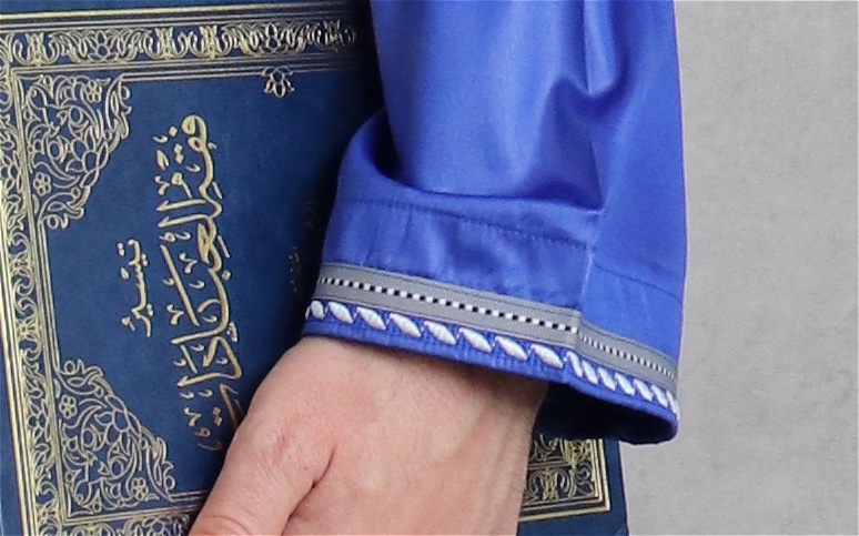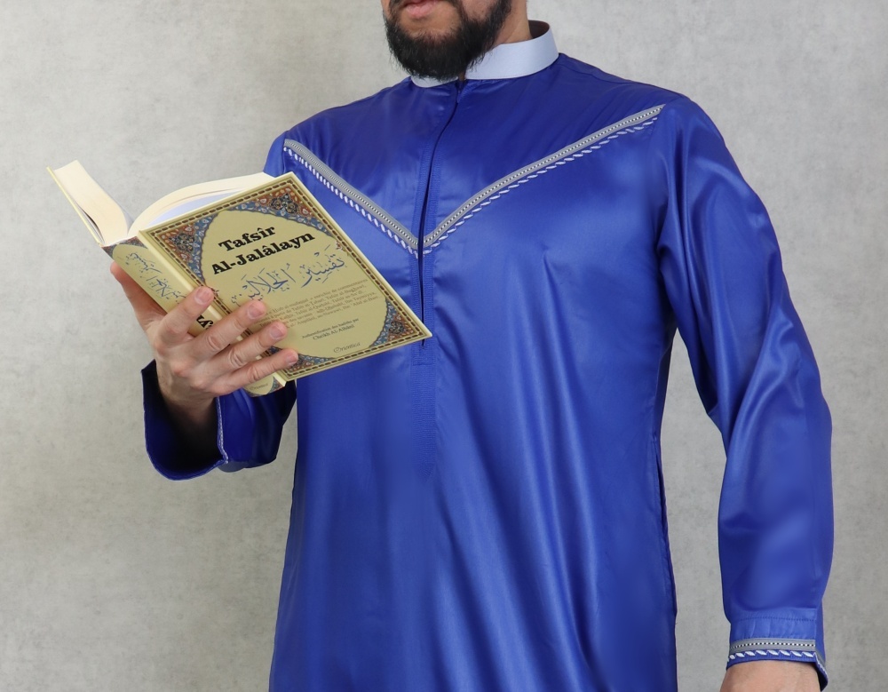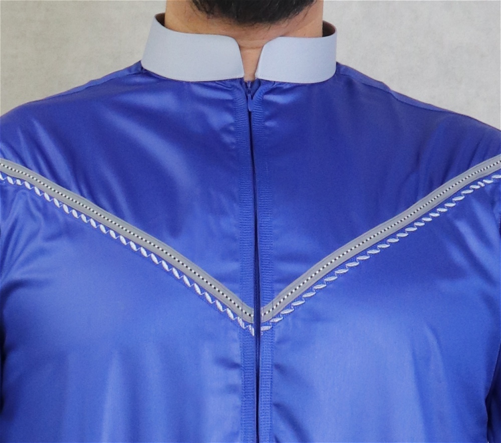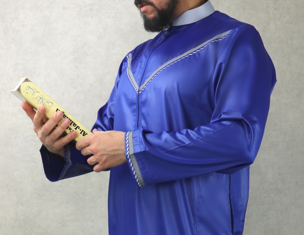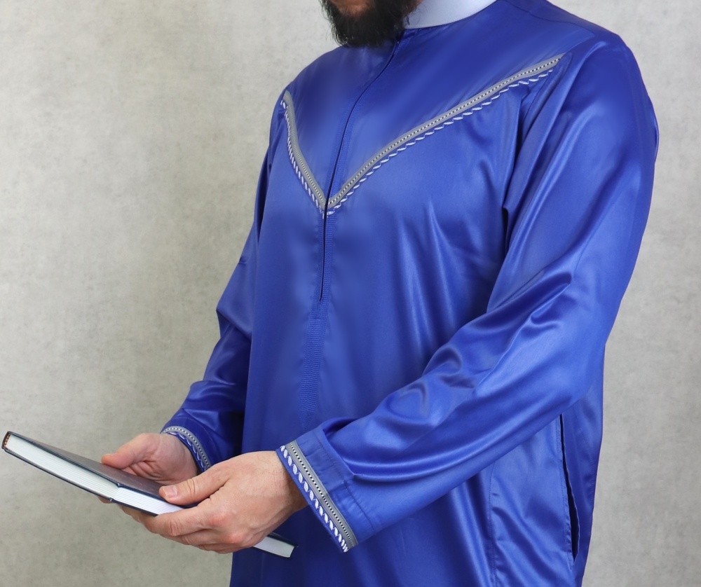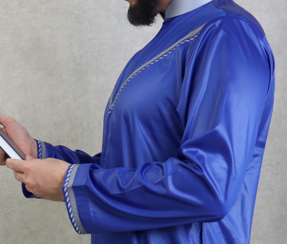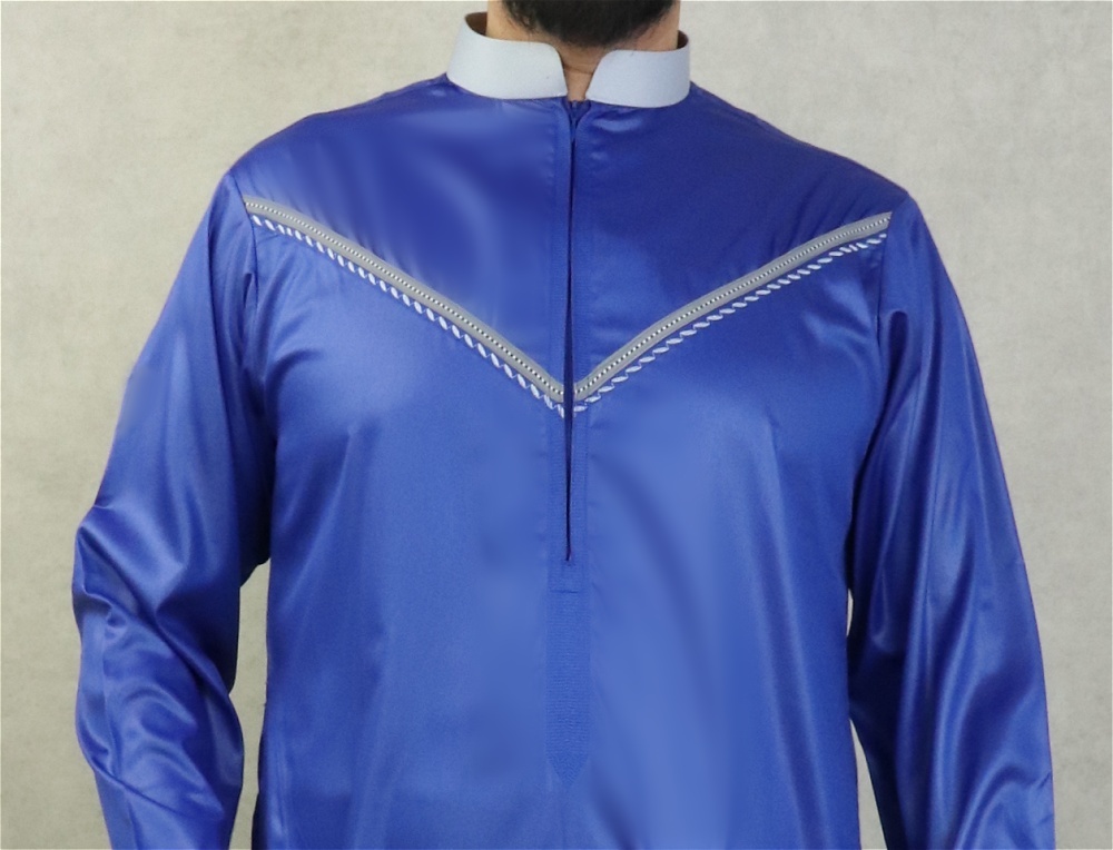 Qamis de couleur bleu roi brillant avec col et broderies de couleur gris clair.