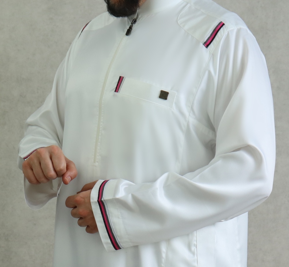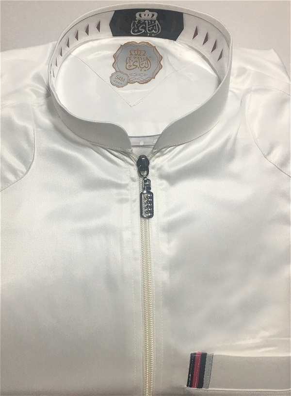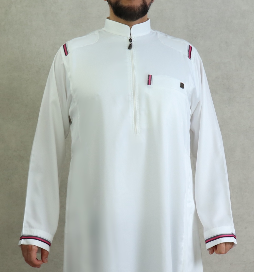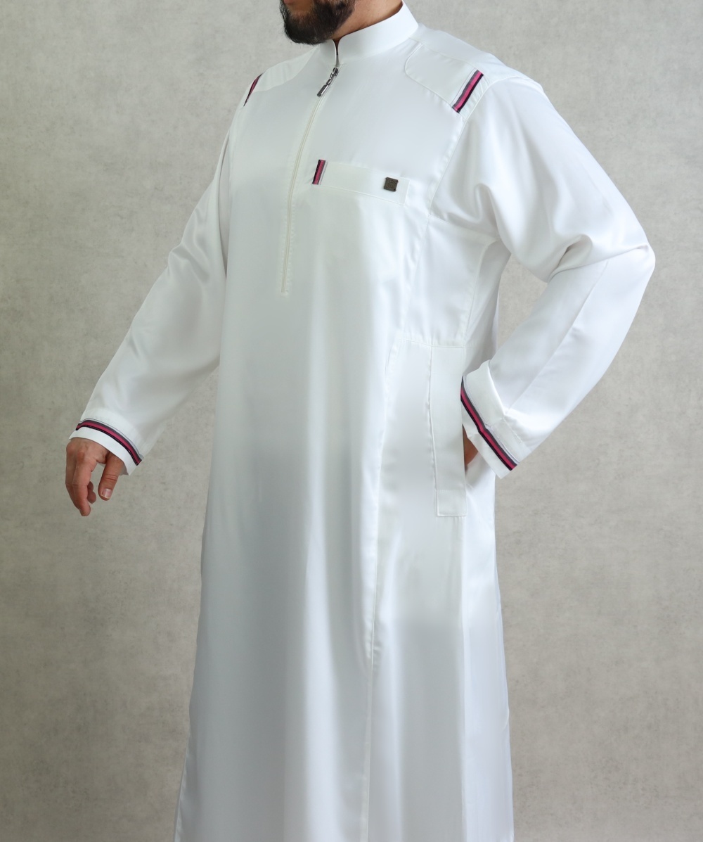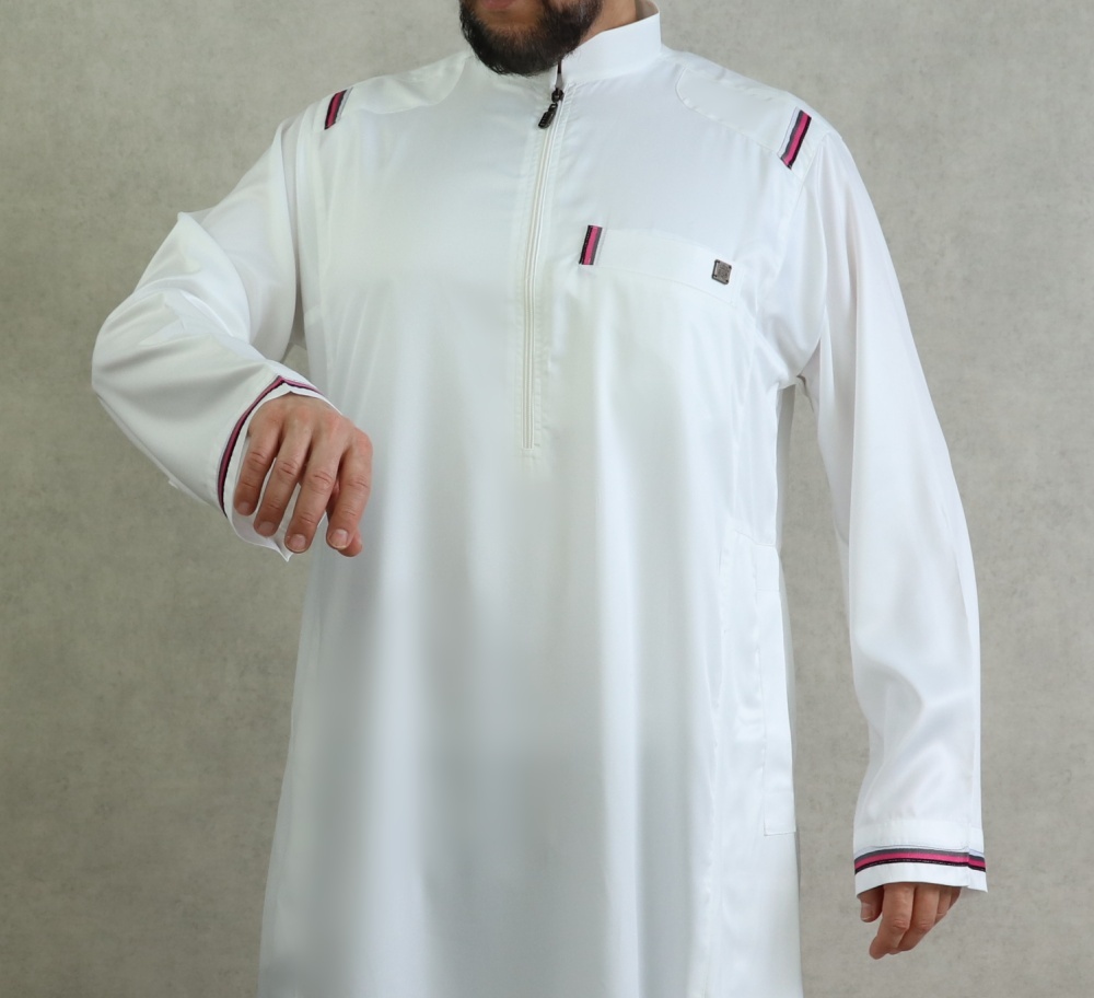 Qamis blanc sobre et moderne avec poche sur le devant. Bandes décoratives au niveau des épaules et des poignets. Fermeture zip au niveau de la poitrine. Tissu satiné. Col mao.