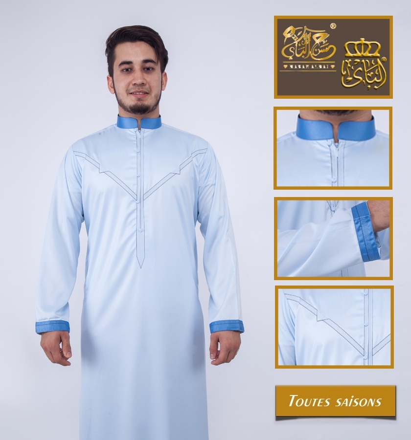 Qamis de couleur bleu ciel avec col bleu. Broderie bleue sur la poitrine et les manches. Comme sur la photo.