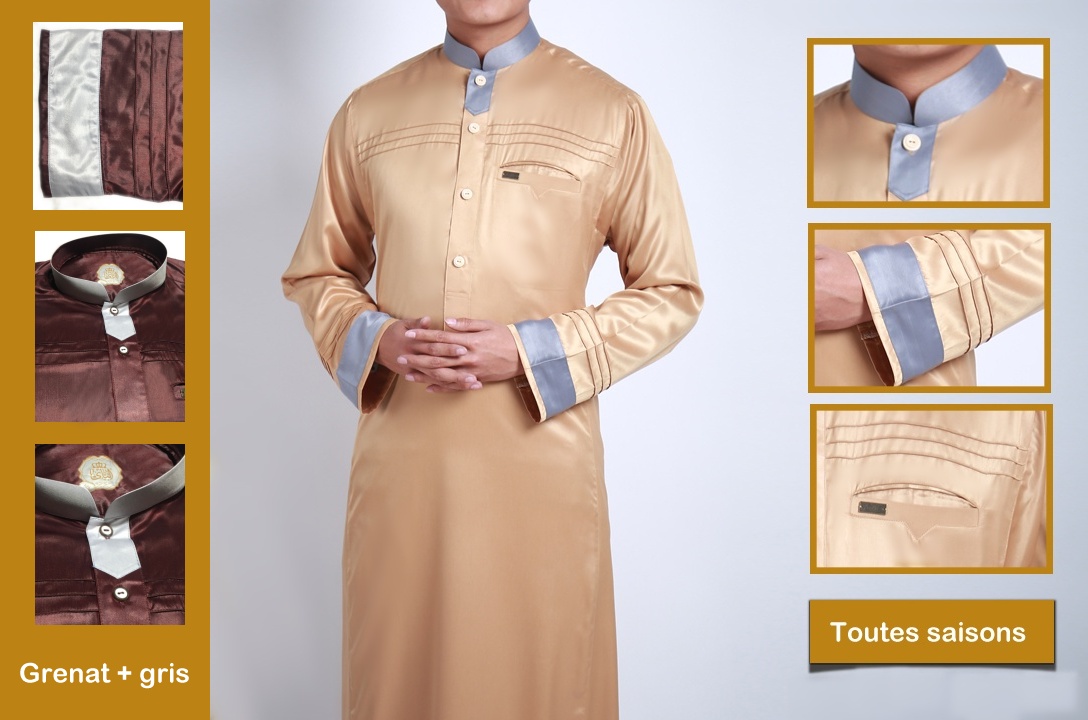 Qamis moderne de luxe tissu satiné pour homme - Couleur beige foncé et aubergine - REF. 35341 (45.00 €)