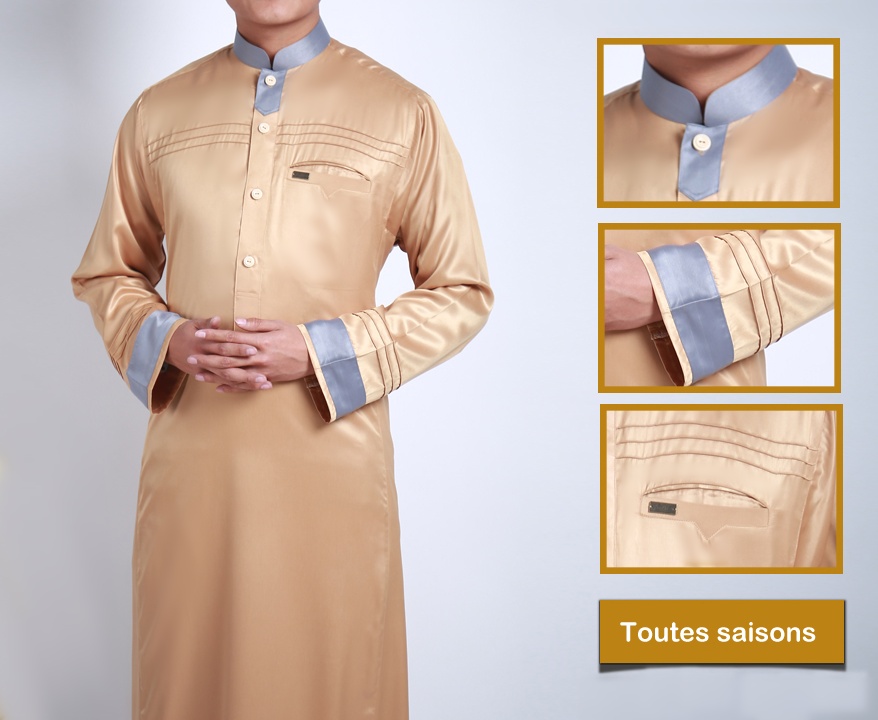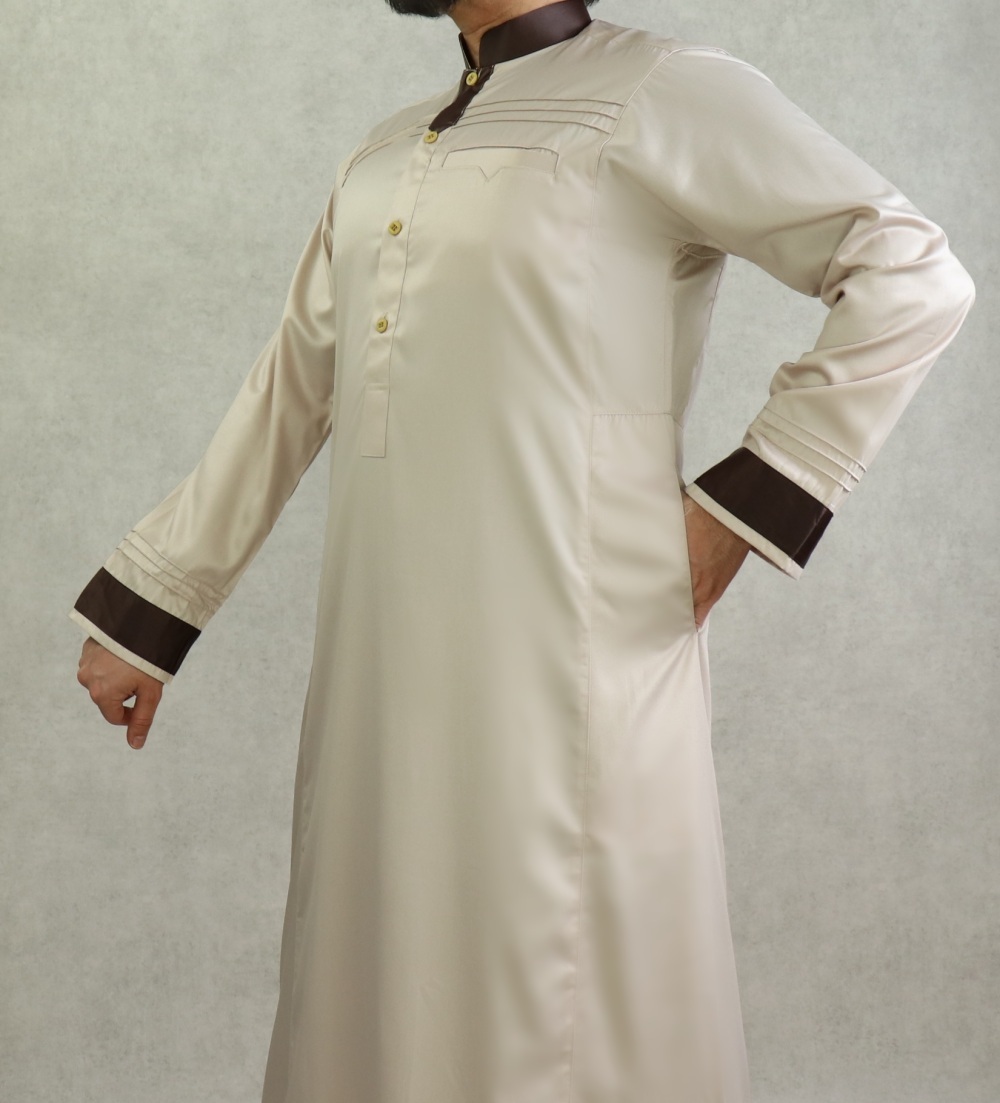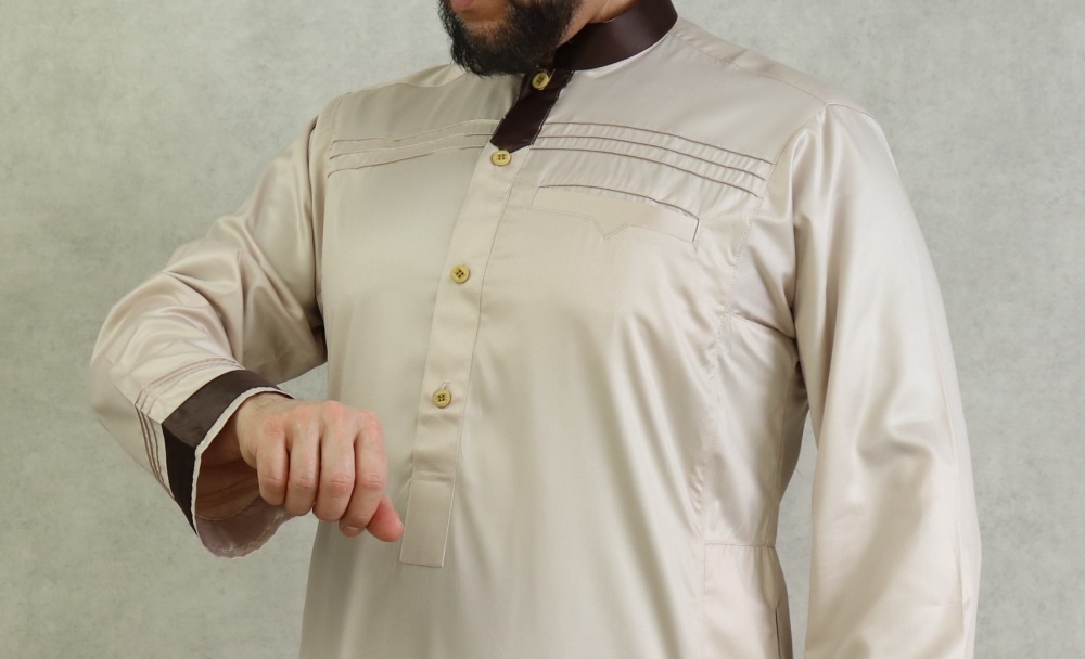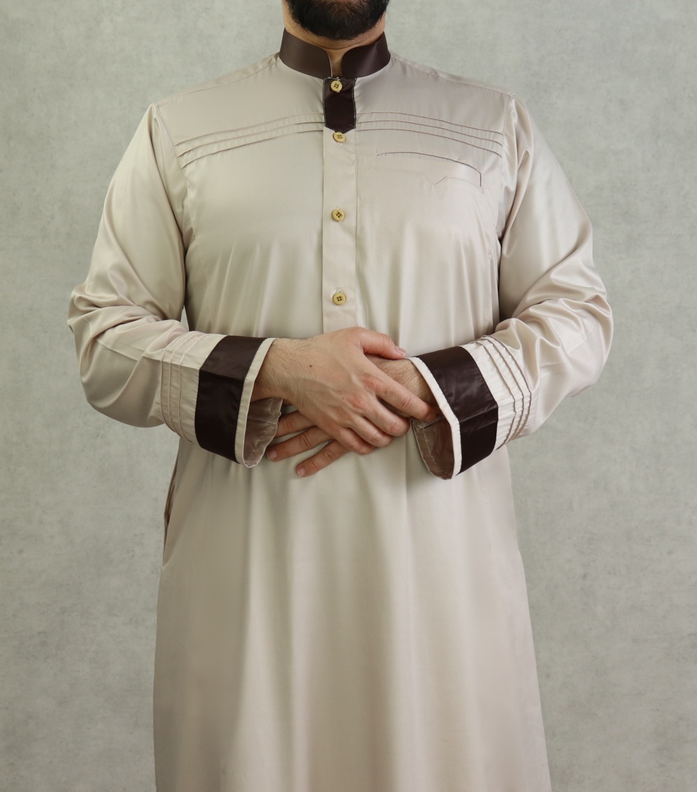 Qamis de marque Albai de couleur beige. Décorations et parties de couleur marron foncé au niveau du col, de la poitrine et des manches (poignets).