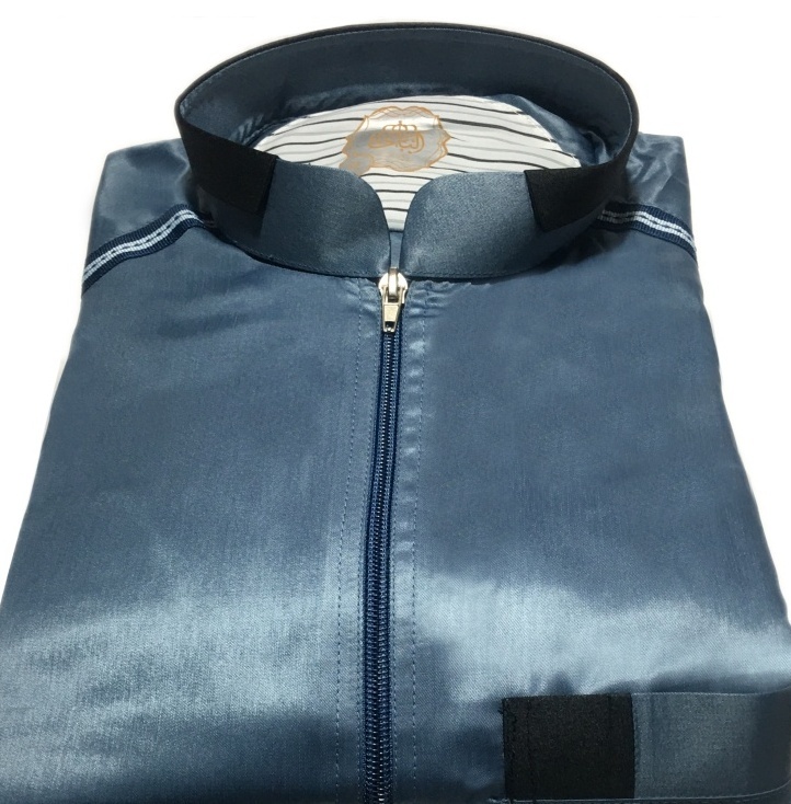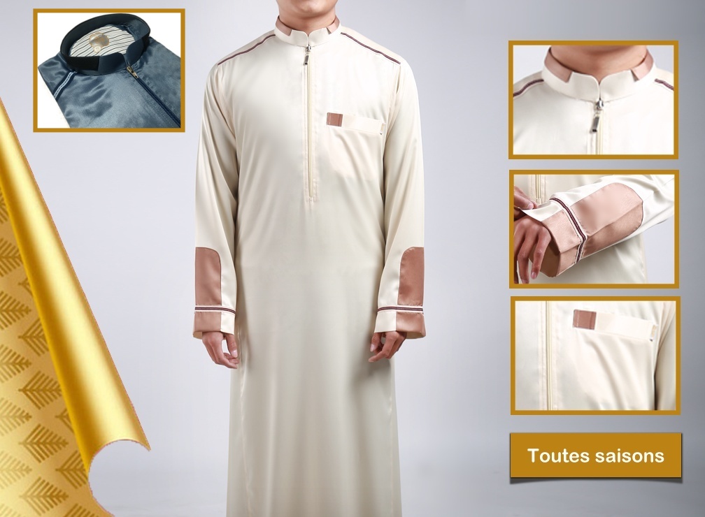 Qamis long, manches longues, ouverture zip au niveau de la poitrine. Tissu fluide et très agréable de qualité supérieure, brillant (satiné), toutes saisons. Très bonnes coutures et finitions. Une poche stylée au niveau du coeur et Deux grandes poches latérales avec sous-poches internes (pour clés ou petits objets).
