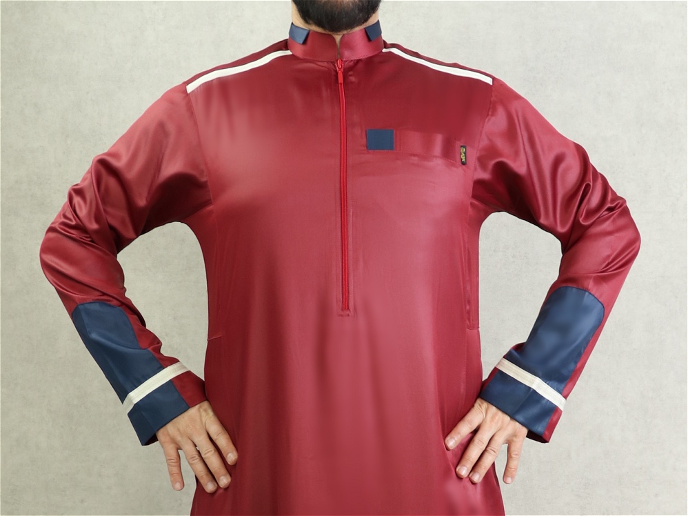 Qamis long, manches longues, ouverture zip au niveau de la poitrine. Tissu fluide et très agréable de qualité supérieure, brillant (satiné), toutes saisons. Très bonnes coutures et finitions. Une poche stylée au niveau du coeur et deux grandes poches latérales avec sous-poches internes (pour clés ou petits objets).