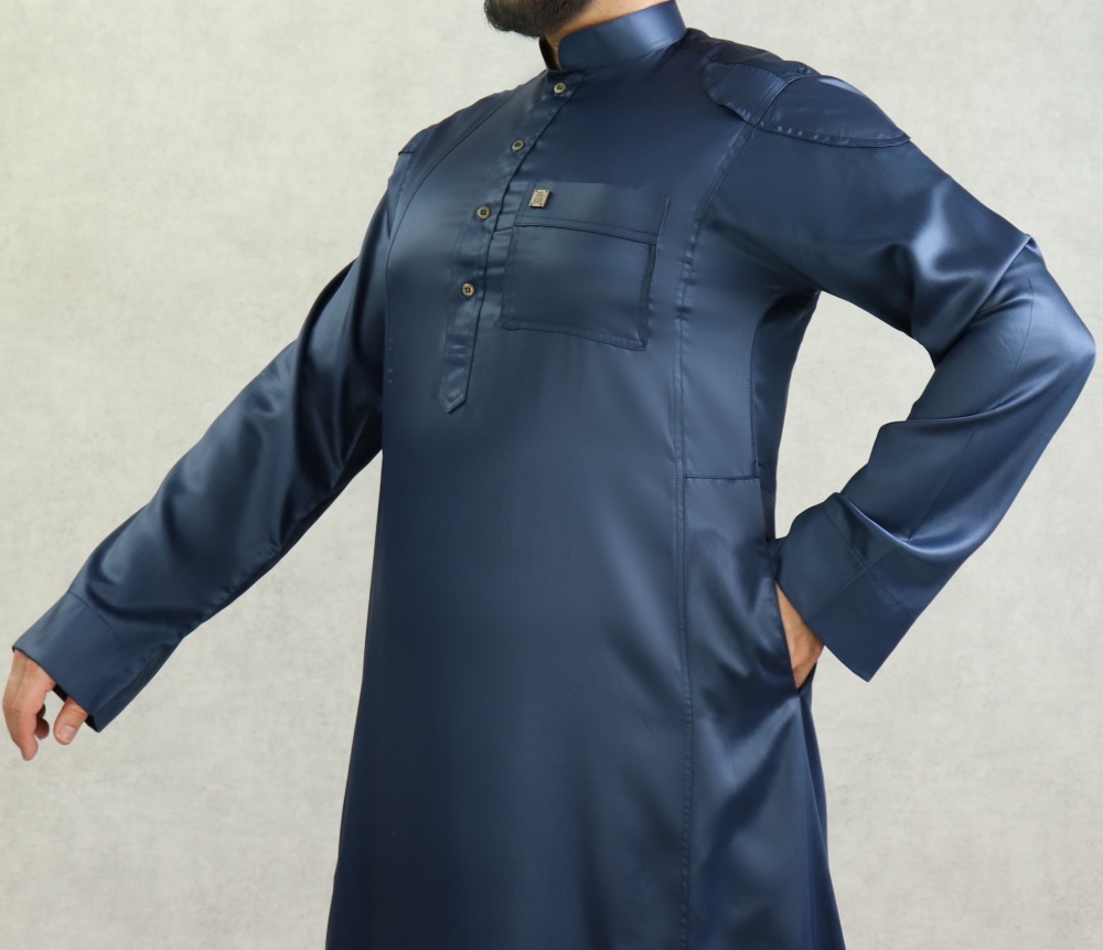Qamis de marque Albai de couleur bleu nuit avec décorations au niveau des épaules (Comme sur la photo).