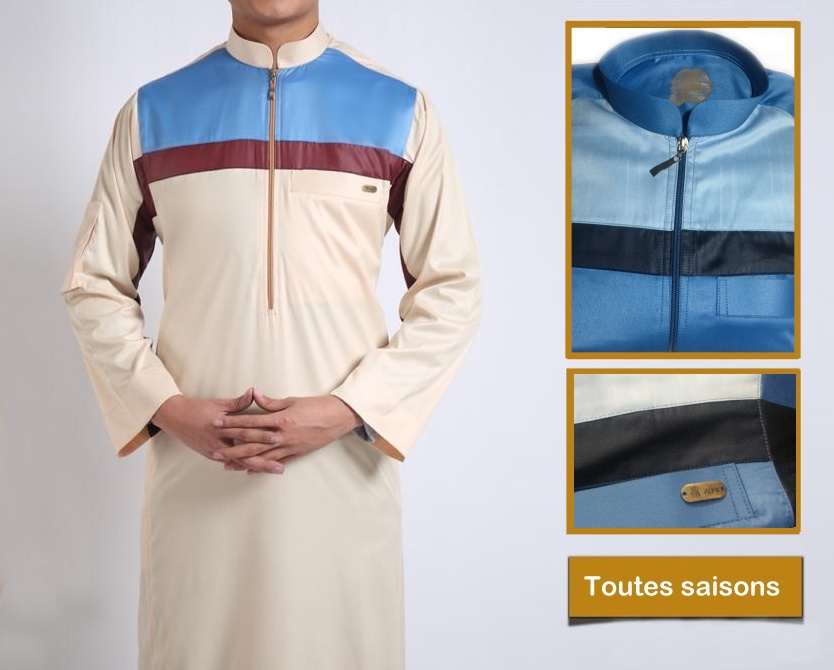 Qamis long, manches longues, fermeture zip au niveau de la poitrine. Tissu fluide et très agréable de qualité supérieure, brillant (satiné), toutes saisons. Très bonnes coutures et finitions. Poche au niveau de la poitrine et deux grandes poches latérales avec sous-poches internes (pour clés ou petits objets).