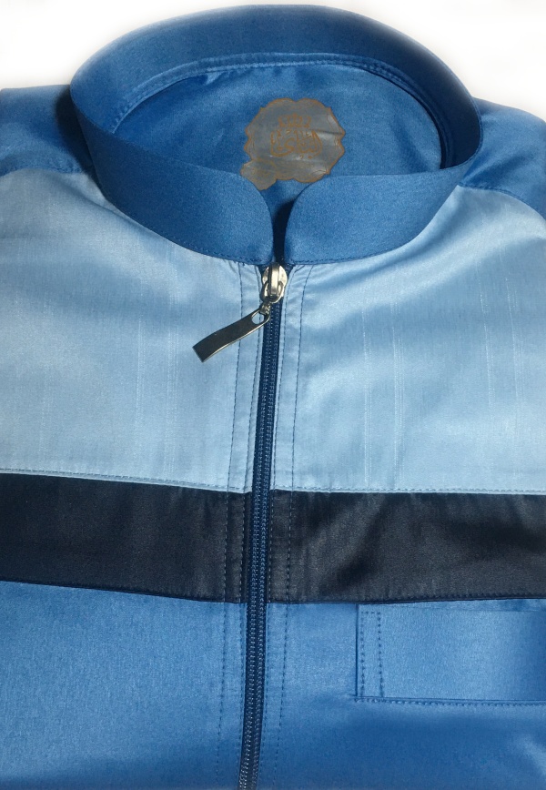 Qamis de marque Albai de couleur bleu avec parties bleu ciel sur la poitrine. Bande bleu nuit sur allant de la poitrine jusqu'aux manches. Poche originale au niveau du haut du bras droit.