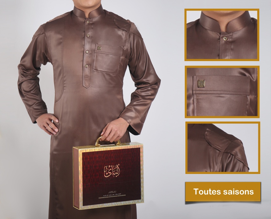 Qamis de marque Albai de couleur marron avec décorations au niveau des épaules (Comme sur la photo).