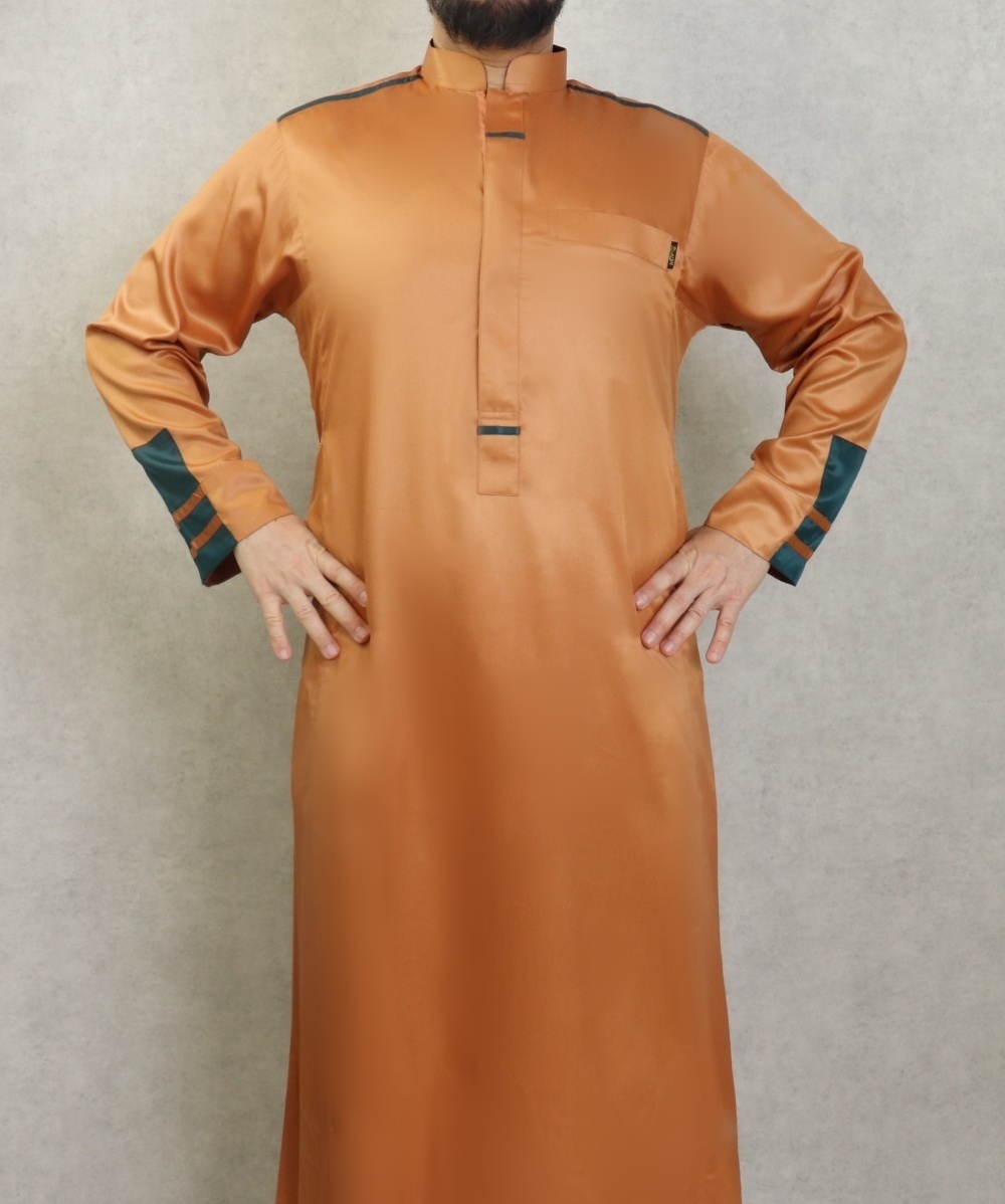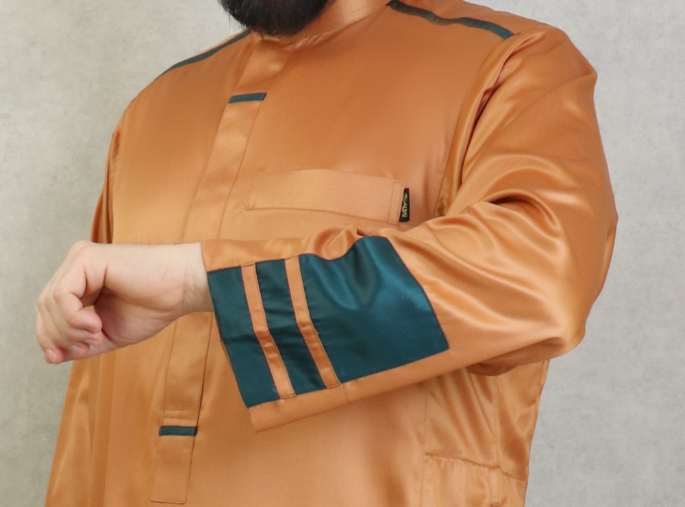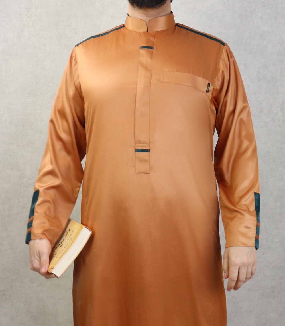Qamis moderne avec poche sur le devant. Bandes décoratives au niveau des épaules du devant et des poignets. Fermeture zip au niveau de la poitrine. Tissu satiné. Col mao.