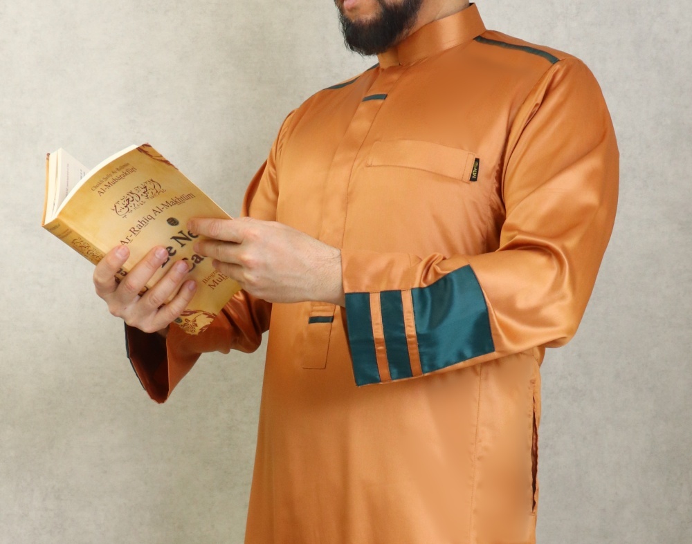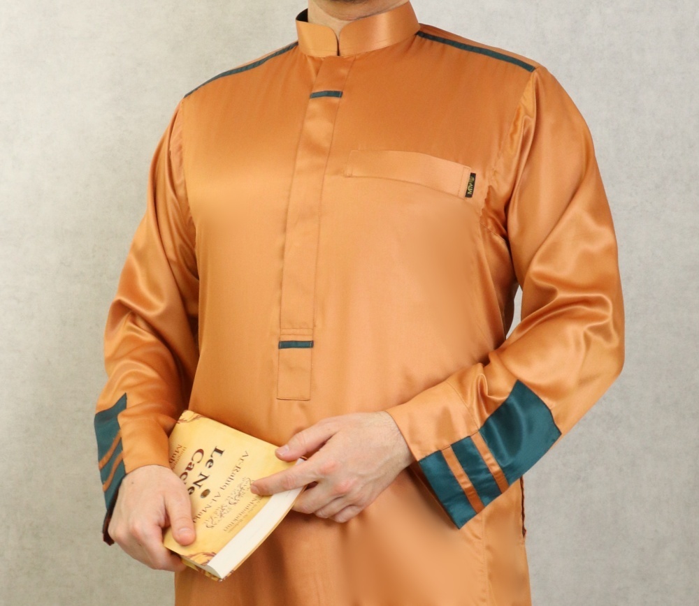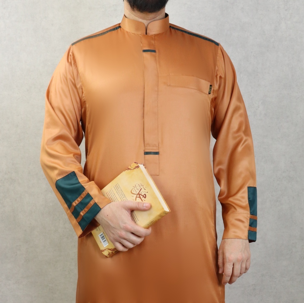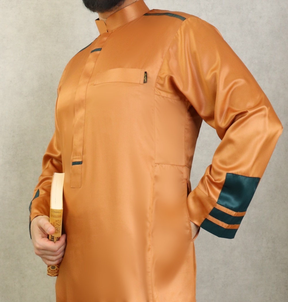 Qamis moderne avec poche sur le devant. Bandes décoratives au niveau des épaules du devant et des poignets. Fermeture zip au niveau de la poitrine. Tissu satiné. Col mao.