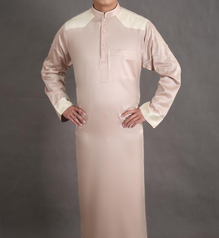 Qamis beige moderne avec poche sur le devant. Bandes décoratives vertes au niveau du devant et des poignets. Fermeture boutons argentés au niveau de la poitrine. Tissu satiné. Col mao.
