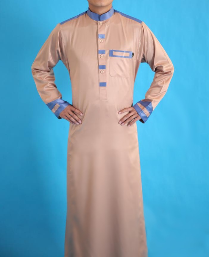 Qamis homme de qualité supérieure couleur Beige foncé avec bandes bleu gris au niveau des épaules - REF. 31919 (45.00 €)