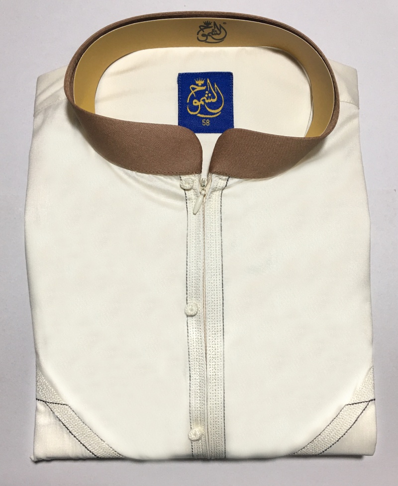 Qamis de couleur blanc cassé satiné avec broderies sur la poitrine sur les manches. Col et poignets de couleur camel.