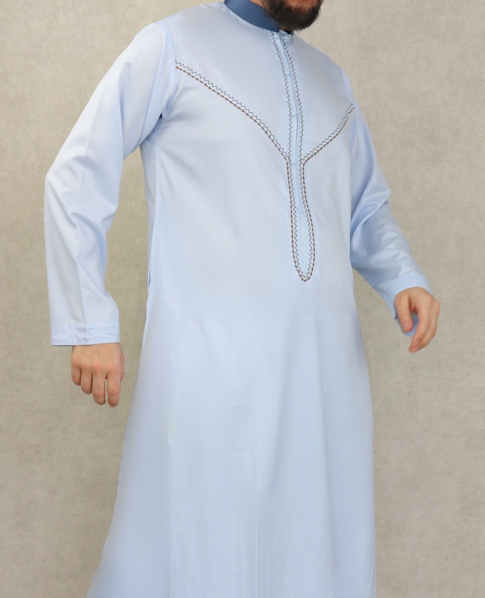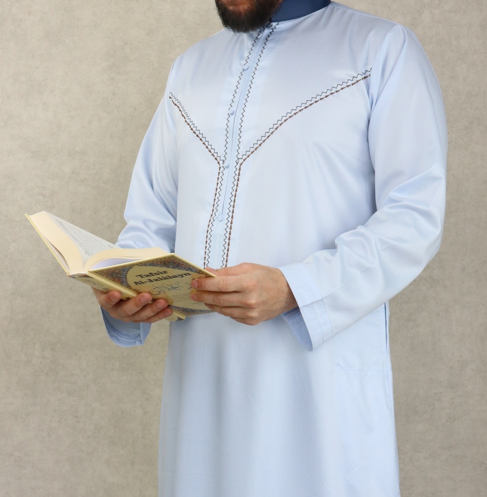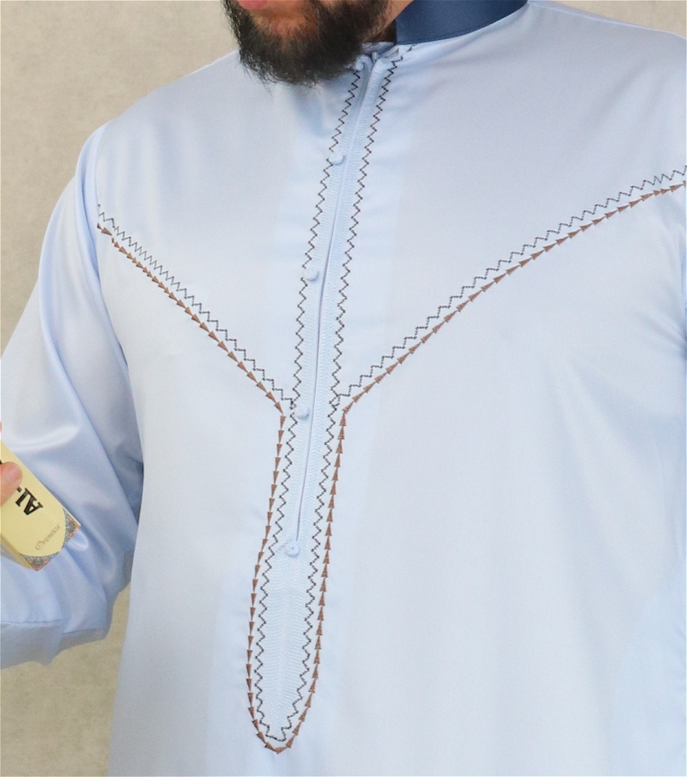 Qamis long, manches longues, ouverture zip cachée au niveau de la poitrine. Décoration sous forme de faux boutons. Col de couleur bleu marine. Tissu fluide et très agréable de qualité supérieure, légèrement satiné, toutes saisons.