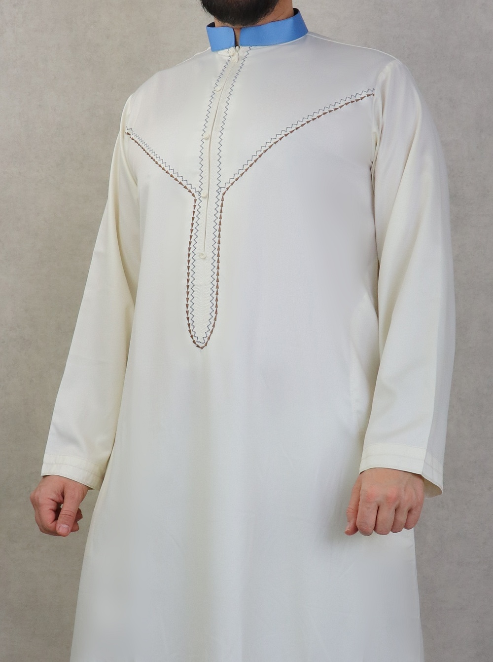Qamis long, manches longues, ouverture zip cachée au niveau de la poitrine. Décoration sous forme de faux boutons. Col de couleur bleu. Tissu fluide et très agréable de qualité supérieure, légèrement satiné, toutes saisons.