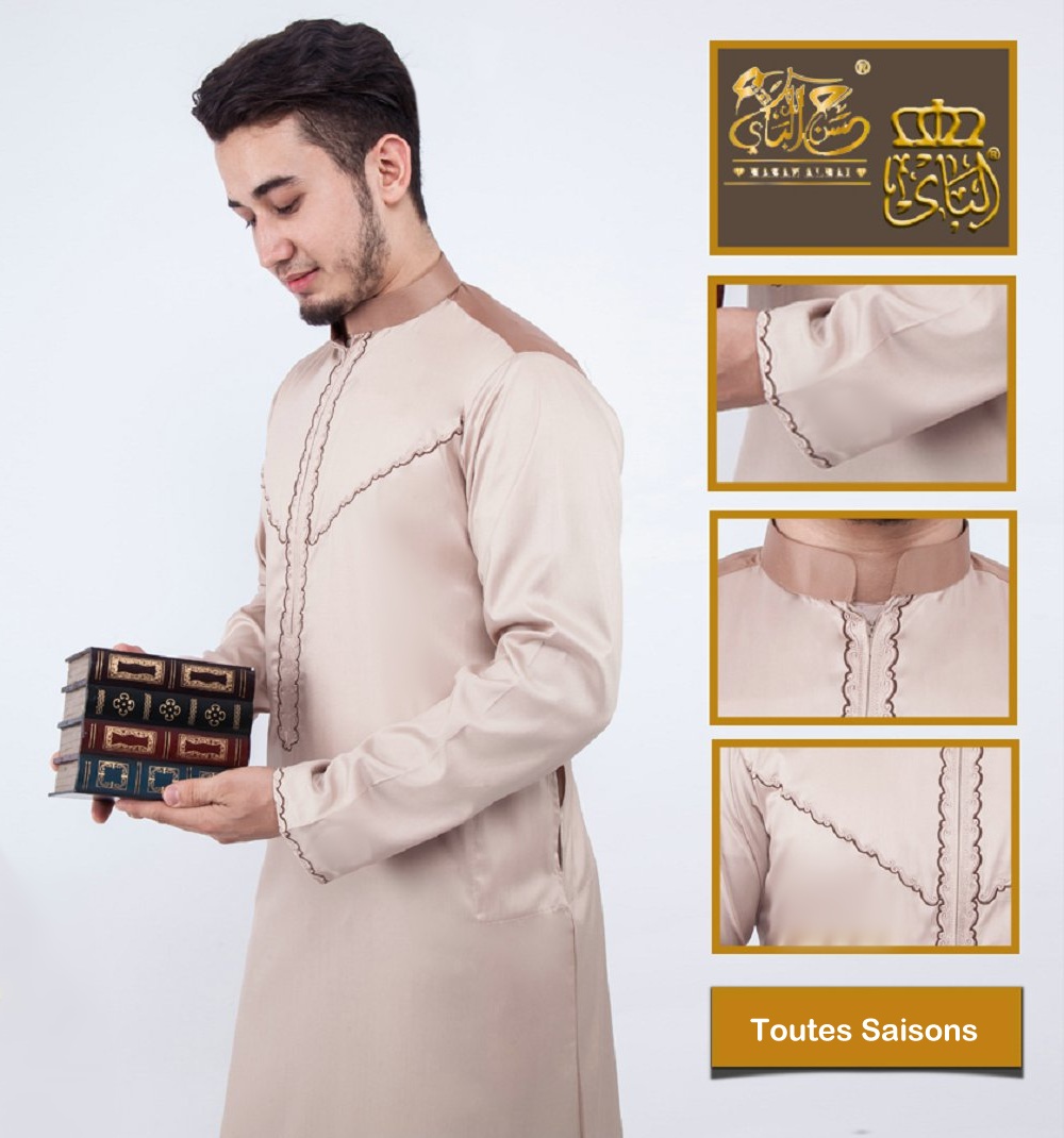 Qamis traditionnel élégant pour homme de qualité supérieure avec broderies et tissu satiné - Couleur beige et camel Vetement & Accessoire
