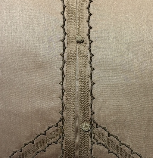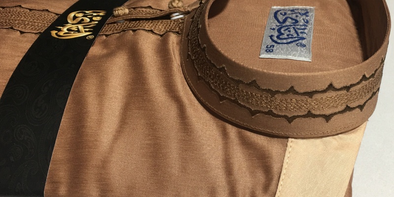 Qamis de marque Albai de couleur marron avec bande beige au niveau des épaules jusqu'au haut du dos. Broderies au niveau du col, de la poitrine et des manches (poignets).
