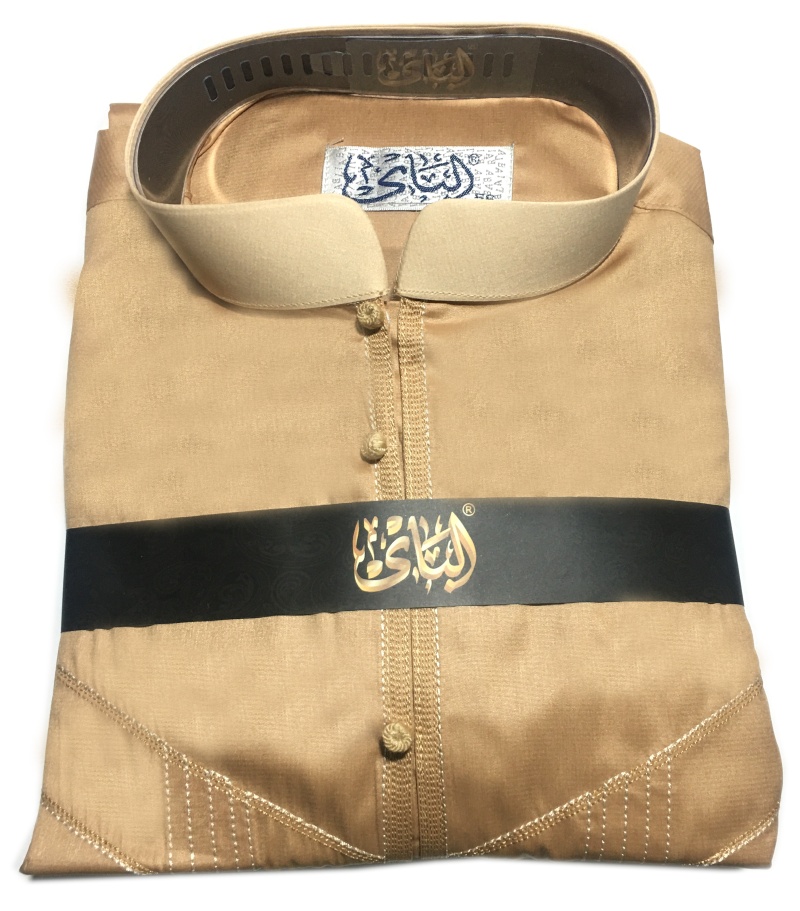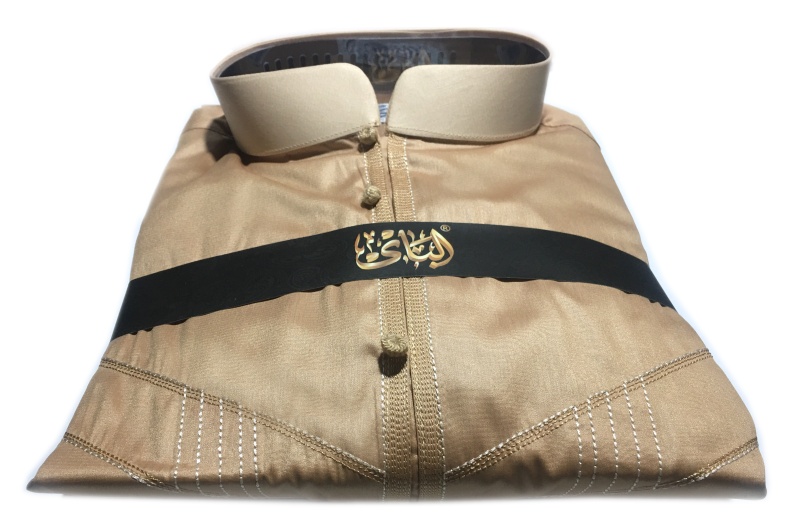 Qamis original de couleur camel et col beige bouton pression décorés (tissés). Tissu satiné.