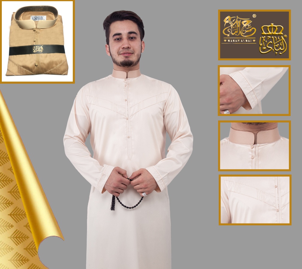 Qamis traditionnel homme de qualite superieure couleur camel et beige tissu satine avec boutons pression decores