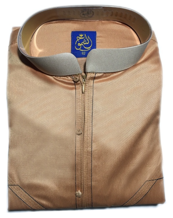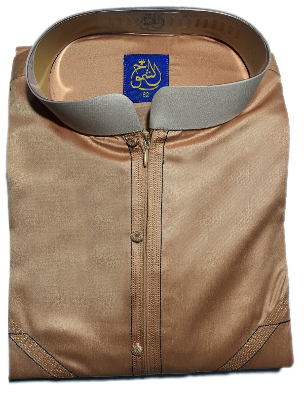 Qamis de couleur marron caramel avec broderies sur la poitrine sur les manches. Col couleur beige.