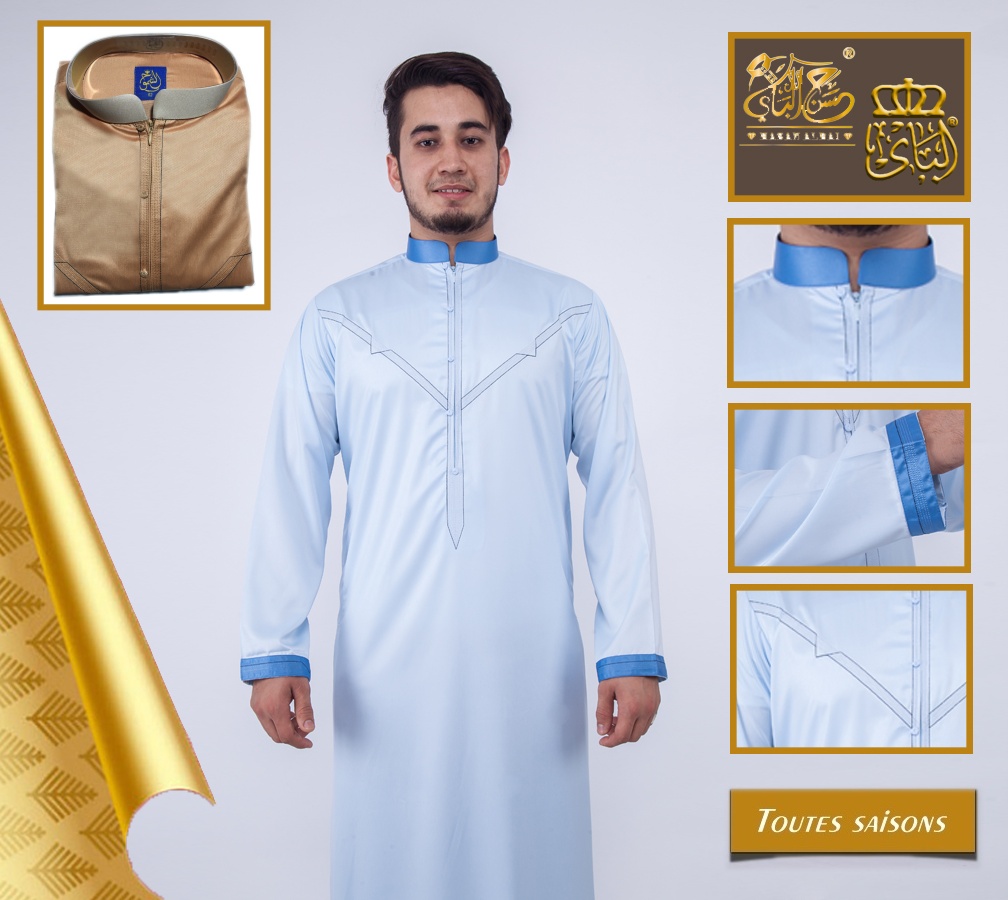 Qamis long, manches longues, ouverture zip cachée au niveau de la poitrine. Tissu fluide et très agréable de qualité supérieure, légèrement satiné, toutes saisons. Très bonnes coutures et finitions. Décoration au niveau de la poitrine et des poignets. Deux grandes poches latérales.