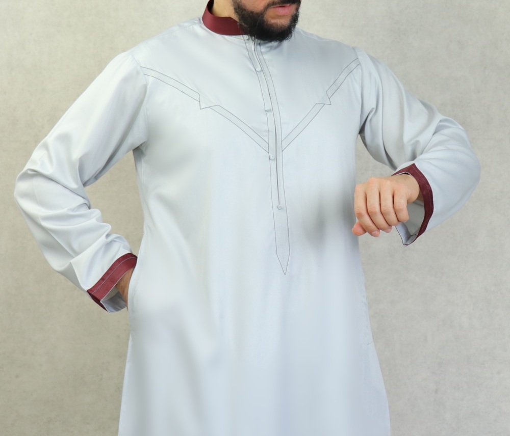 Qamis de couleur gris clair satiné avec broderies sur la poitrine sur les manches. Col et poignets de couleur grenat foncé.