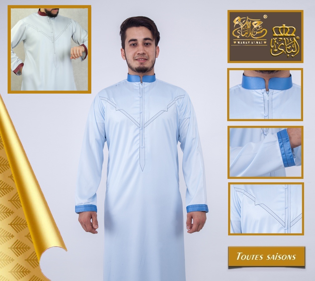 Qamis long, manches longues, ouverture zip cachée au niveau de la poitrine avec de faux boutons tissés.