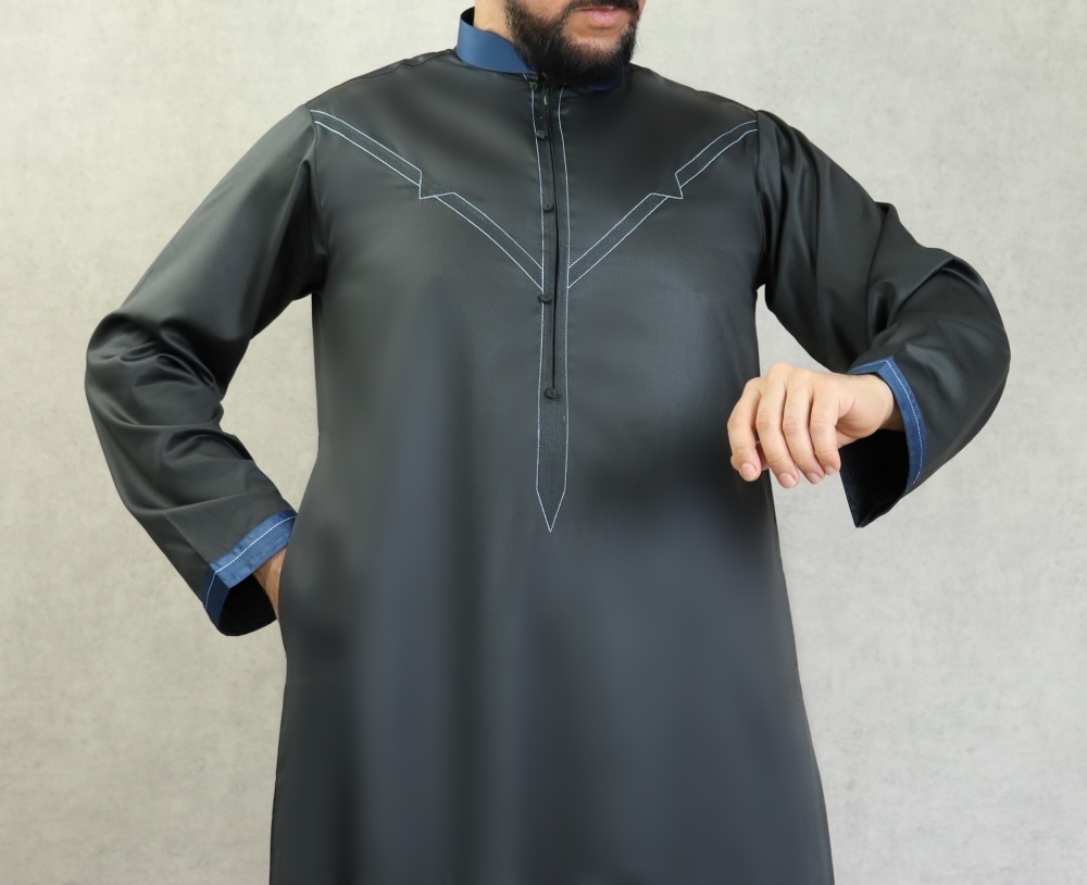 Qamis long, manches longues, ouverture zip cachée au niveau de la poitrine avec de faux boutons tissés.