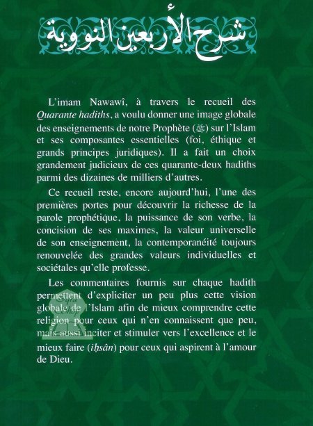 L’imam Nawawî, à travers le recueil des Quarante Hadiths, a voulu donner une image globale des enseignements de notre Prophète (pbsl) sur l’Islam et ses composantes essentielles (foi, éthique et grands principes juridiques). Il a fait un choix grandement judicieux de ces quarante-deux hadiths parmi des dizaines de milliers d’autres.
