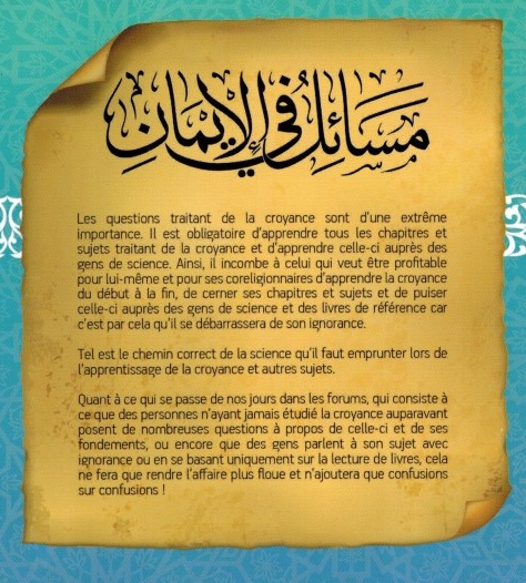 Les questions traitant de la croyance sont d'une extrême importance. il est obligatoire d'apprendre tous les chapitres et sujets traitant de la croyance et d'apprendre celle-ci auprès des gens de science. Ainsi, il incombe à celui qui veut être profitable pour lui-même et pour ses coreligionnaires d'apprendre la croyance du début à la fin, cerner ses chapitres et sujets et de puiser celle-ci auprès des gens de science et des livres de références car c'est par cela qu'il se débarrassera de son ignorance.