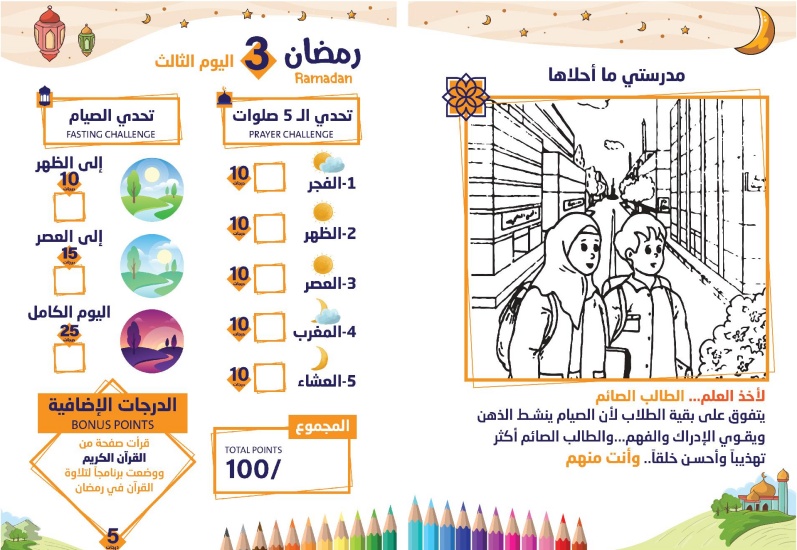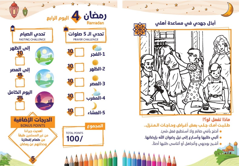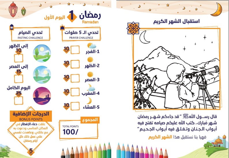 Chaque jour l'enfant va comptabiliser ses points par rapport au "défi des cinq prières quotidiennes" et au "défi du jeûne"... Par ailleurs, il apprendra chaque jour un nouveau hadith du prophète (SAW) et pourra réaliser un beau coloriage correspondant au hadith...