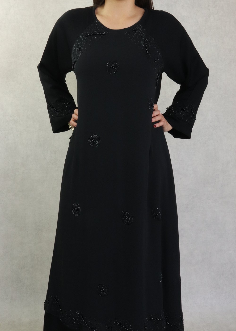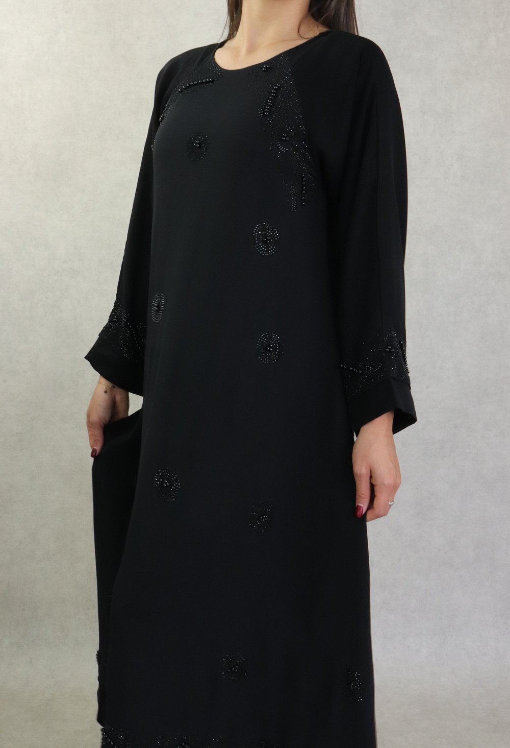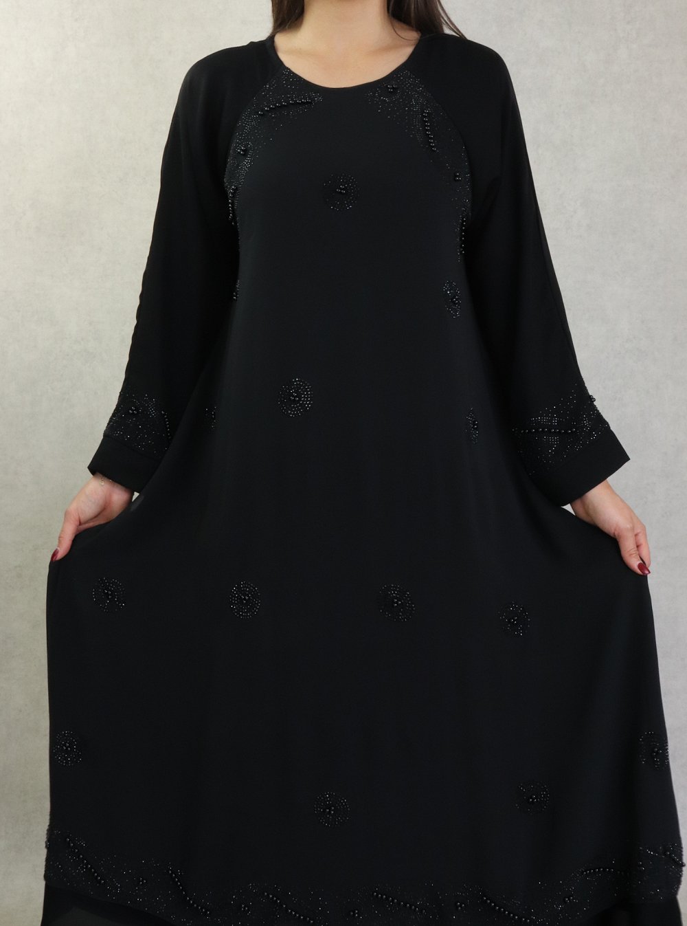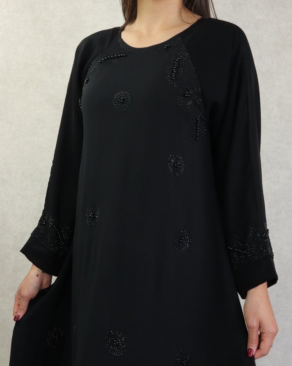 Robe Abaya Dubaï noire de qualité avec nombreuses perles noires et strass - REF. 38118 (45.00 €)