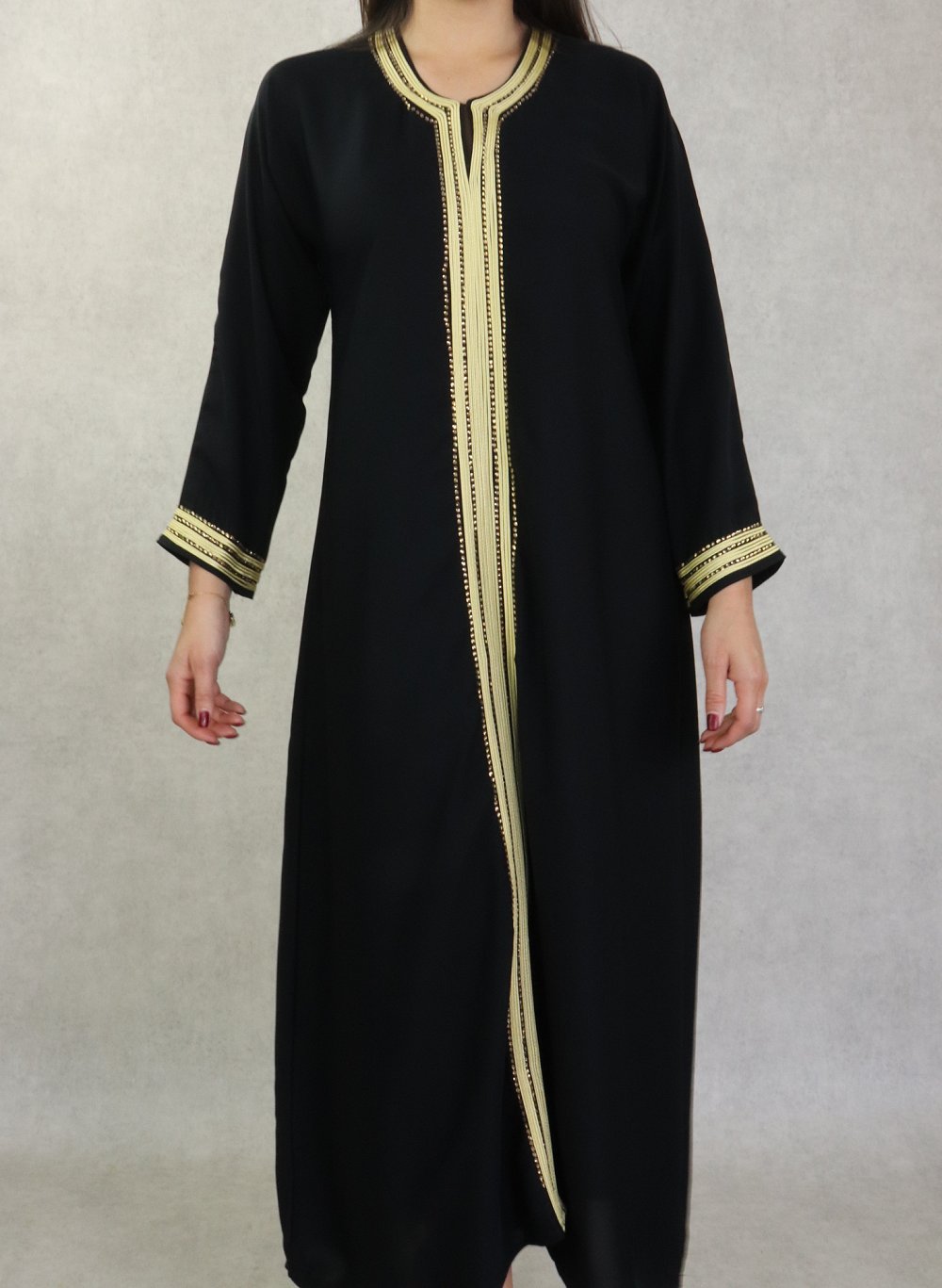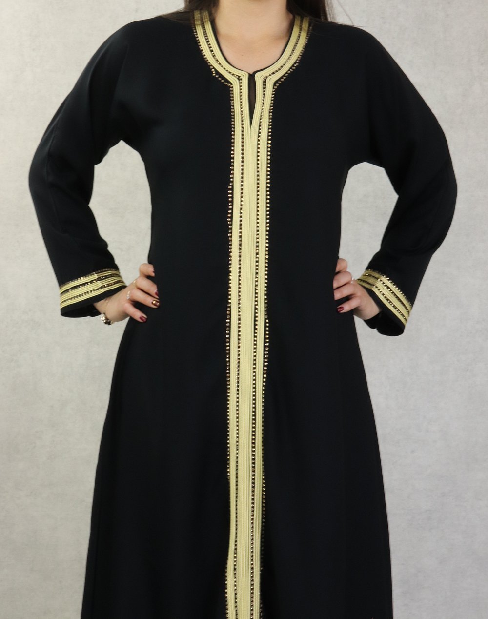 Robe Abaya Dubaï noire de qualité avec bande brodée dorée et strass Vetement & Accessoire
