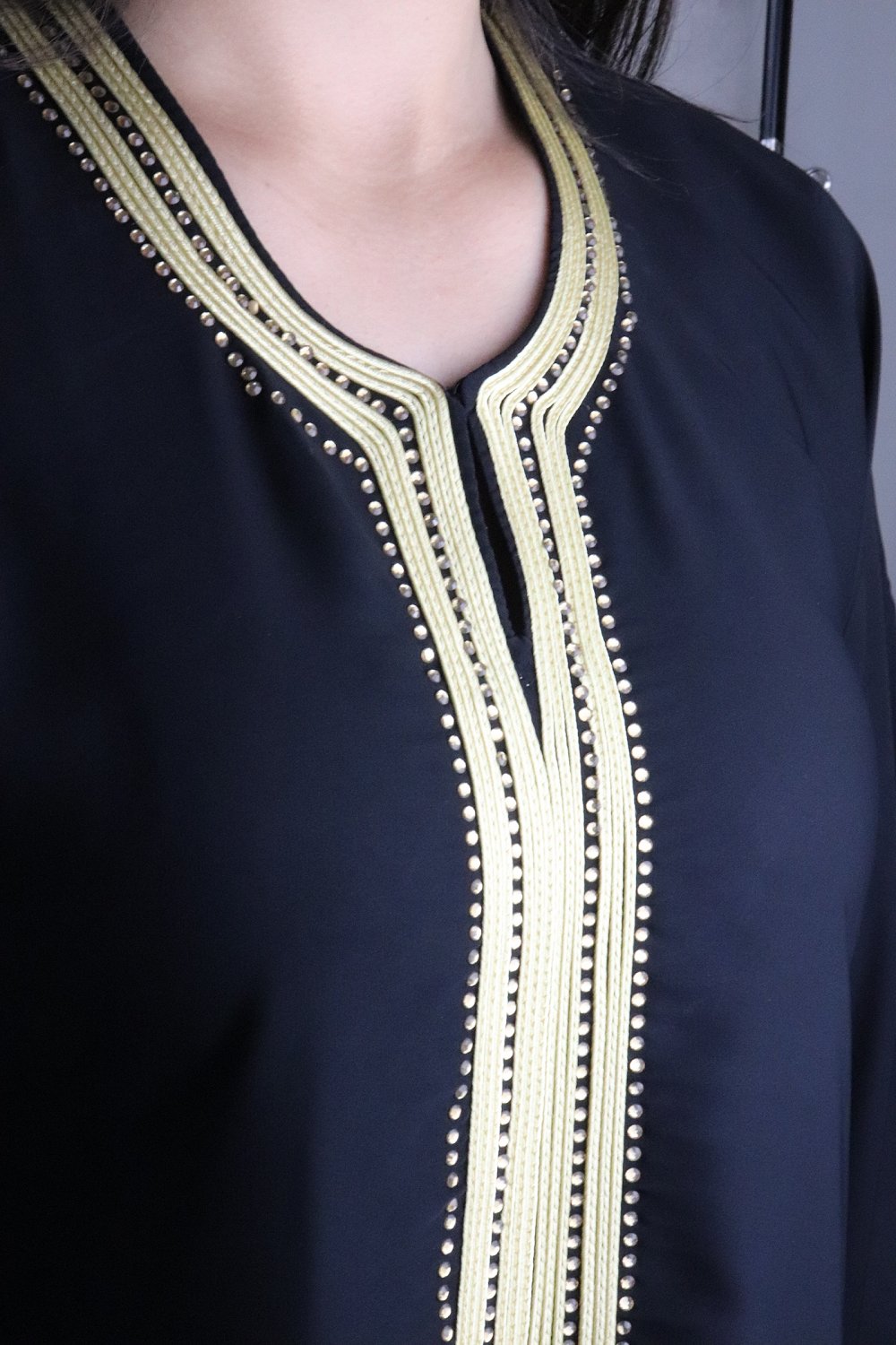 Robe de soirée noire style Abaya Dubaï de qualité avec nombreuses broderies et motifs en strass dorés - REF. 38173 (45.00 €)