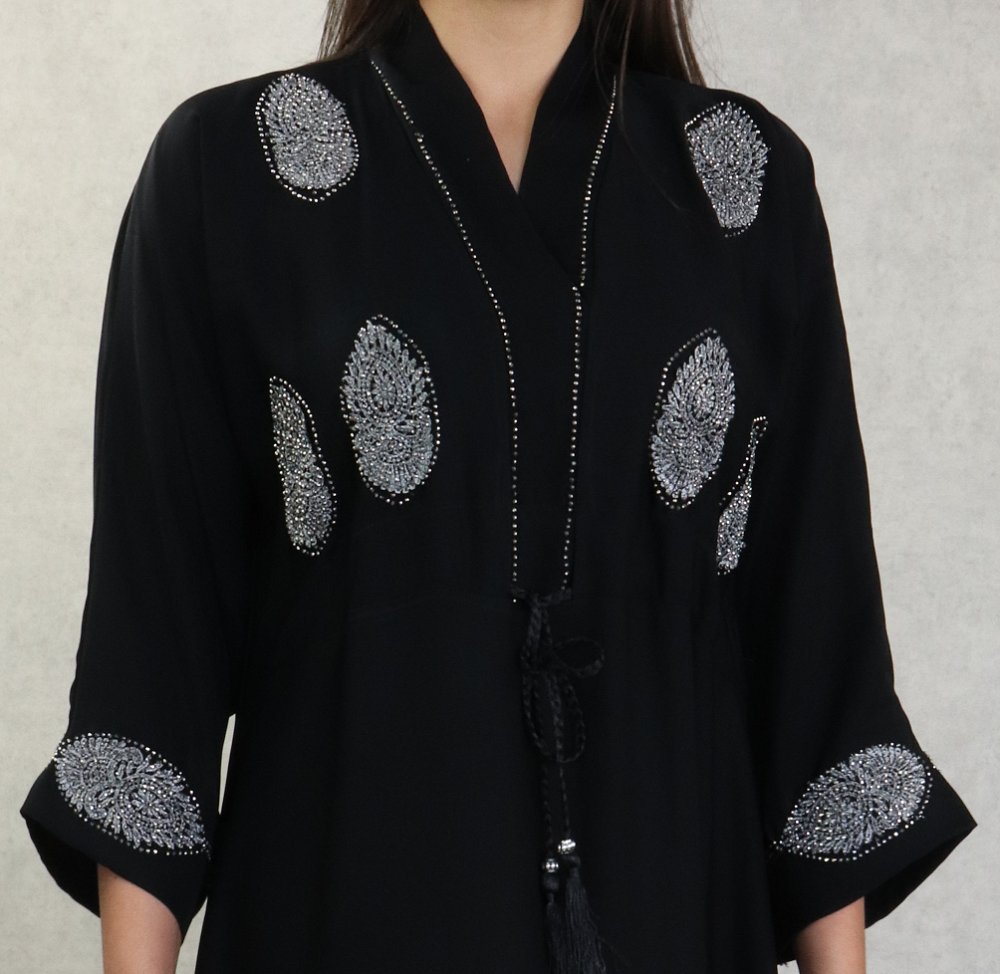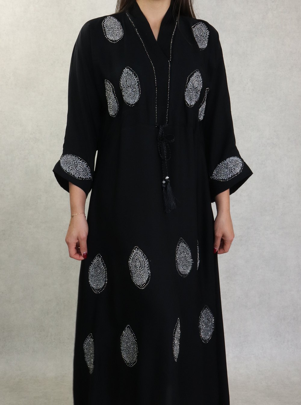 Robe Abaya Dubaï noire de qualité avec broderie et strass argenté et ceinture interne - REF. 38194 (45.00 €)