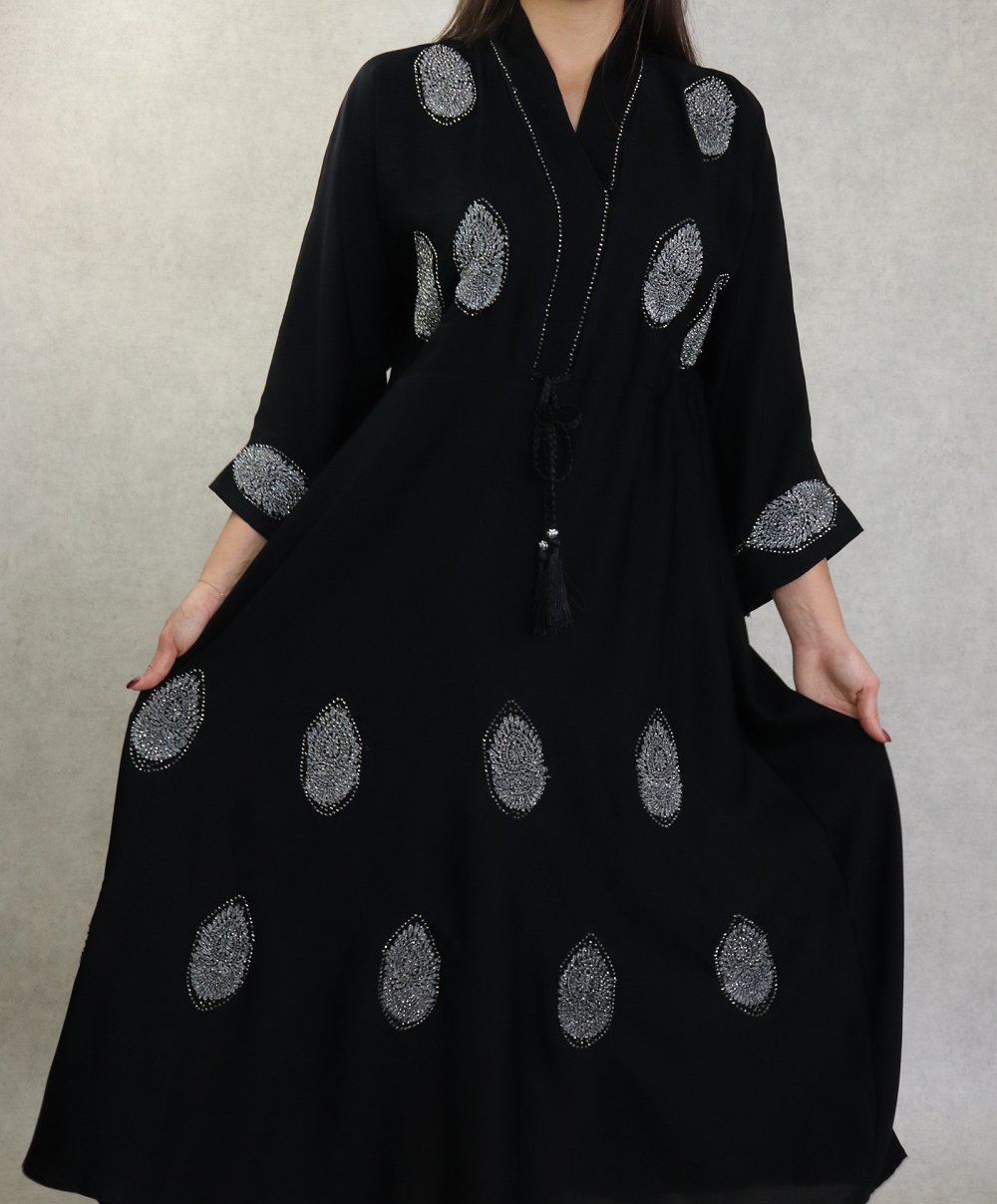 Robe de soirée Abaya Dubaï noire de qualité avec broderie perles et strass argentés - REF. 38190 (49.00 €)