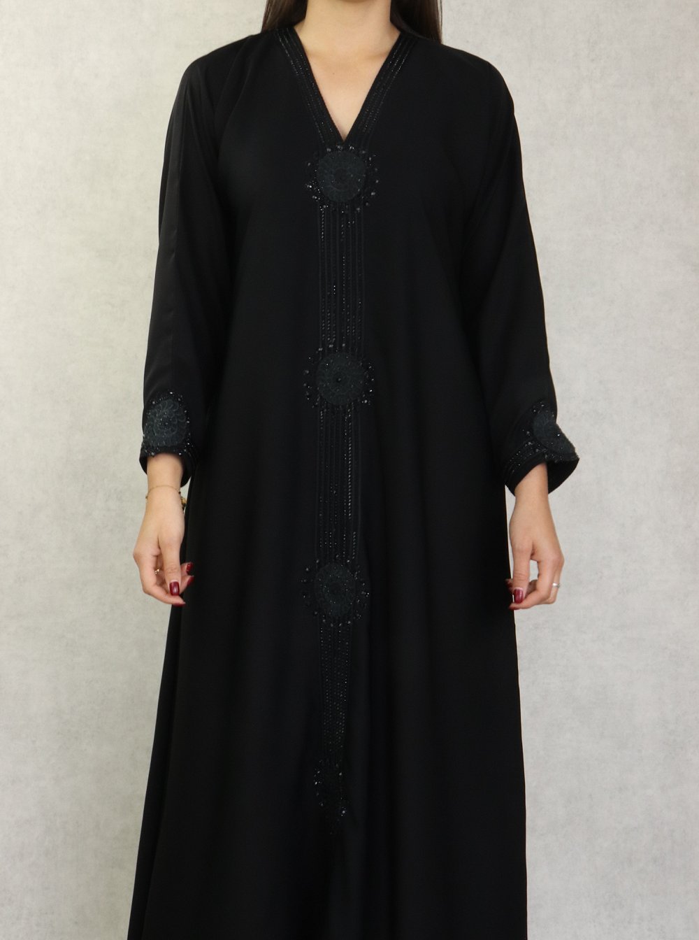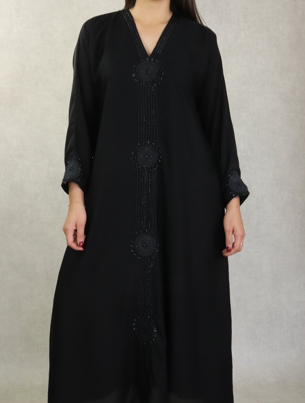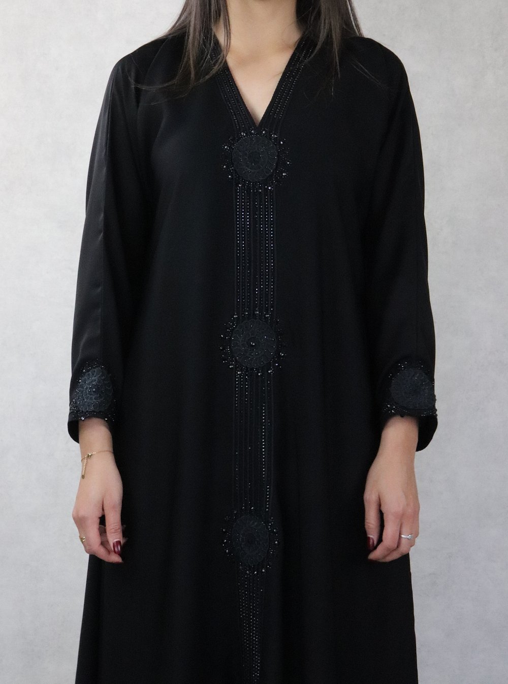Robe Abaya Dubaï noire de qualité avec nombreuses perles noires et strass - REF. 38118 (45.00 €)